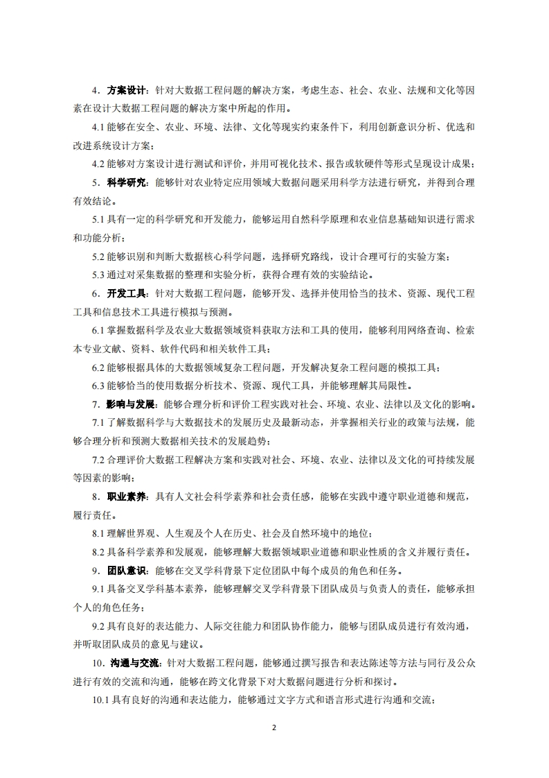 数据科学与大数据技术专业培养方案专业代码:080910T专业名称:数据科学与大数据技术一、培养目标1.基本培养目标培养的学生身心健康、知识结构合理,有健全的人格、高尚的人文情怀和社会责任感,有一定的批判思维与创新能力、科学研究能力、语言文字表达能力、终身学习能力和组织管理能力,具有国际视野和团队合作精神。2.专业培养目标本专业坚持立德树人根本任务,培养德智体美劳全面发展的社会主义建设者和可靠接班人,具有宽厚的数据科学基础理论和系统的专门知识,掌握大数据采集、存储、处理与分析及可视化表达和行业应用的技术与方法,受到大数据思维素养、大数据建模、大数据挖掘、大数据编程、大数据平台与工具等方面系统性的实践训练的创新复合型人才。毕业生可在计算机科学与技术、软件工程、管理科学与工程、农业工程等学科深造提升,也可在企业、政府、金融、高校等行业从事大数据管理与维护、大数据处理与分析、大数据应用等工作。二、毕业要求1.基础知识:具有一定的人文和社会科学素养,掌握人文社会科学学科基本原理和研究方法。1.1具有正确的历史观、世界观、人生观、价值观和高尚的道德品质:12掌握社会科学的基本知识,了解基本研究方法,具有人文情怀和社会责任感。2.工程知识:能够应用数理知识、自然科学和信息技术解决复杂工程问题。2.1掌握数理与逻辑分析、大学物理的基本知识:2.2掌握现代网络技术、通信技术和信息处理技术等的基本知识:2.3掌握生态环境与人类命运、科技创新与社会发展、农业发展与政策法规、传统文化与世界文明等方面的基本知识。3.分析问题:能够应用自然科学和工程科学的基本原理,识别和判断大数据核心科学问题,分析文献获取解决方案并验证其合理性。3.1能够应用数理知识对大数据复杂工程问题进行正确建模和表达,并能通过分析文献寻求解决方案:32能够对大数据复杂工程问题进行设计,提出解决方案:33针对大数据复杂工程问题的关键影响因素,验证解决方案合理性。