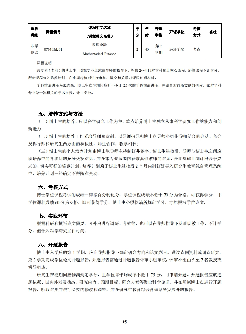统计学博士研究生培养方案(代码:0270)一、学科方向1.027001社会经济统计学Socio--economic Statistics2.027002金融、保险精算与风险管理Financial,Actuarial and Risk Management3.027003质量控制与管理统计Quality Control and Management Statistics二、学科简介及培养目标(一)博士生应成为在本学科上掌握坚实宽广的基础理论和系统深入的专门知识,严谨缜密的逻辑思维能力,在掌握高等数学、概率与数理统计等方法的基础上,着重学习高等经济学理论知识和方法体系,具备把经济理论知识、科学的经验研究方法与实践结合的能力,有效解释经济现象及其规律。至少熟练掌握1门外国语,能熟练阅读本学科的外文文献,具有较强的写作能力和独立从事国际学术交流的能力:具有较强的学术素养、科学精神,诚信可靠,并且具有强烈的科学责任感:本学科博士毕业生具有独立从事研究和教学工作的能力,适合在高等院校、科研机构、经济决策和经济管理部门、金融机构、大型企业等从事高层次的教学、研究和实际经济管理工作。(二)在港、澳、台地区招收的博士生,应热爱祖国和中华文化,遵纪守法,品行端正,自觉拥护祖国统一、拥护“一国两制”、为港澳长期繁荣稳定和实现祖国和平统一做贡献的坚定爱国者,愿意为祖国和居住地的社会发展作出贡献:在海外招收的华人和其他外国籍博士生,应热爱中华文化,对中国友好,主动担当中外交流的文化使者,遵纪守法,品行端正,愿为社会发展作出贡献。(三)身心健康。三、学制和学习年限博士生的学制为3年,非全日制学习年限不少于4年。博士生的学习年限,根据情况可适当延长,最长不得超过7年。四、课程设置及学分要求本学科要求修满20学分。其中,公共学位课4学分,专业学位课8学分,非学位课8学分。课程课程中文名称学学开课考核课程编号开课单位备注类别(课程英文名称)分时学期方式第一外语(英语)可第1105590da1190学期外国语学院考试共First Foreign Language(English)港澳学中国现代化理论与实践研究区台侨第1马克思主义105590da14Chinese Modernization Theory36课考试学期学院and Practice Research13