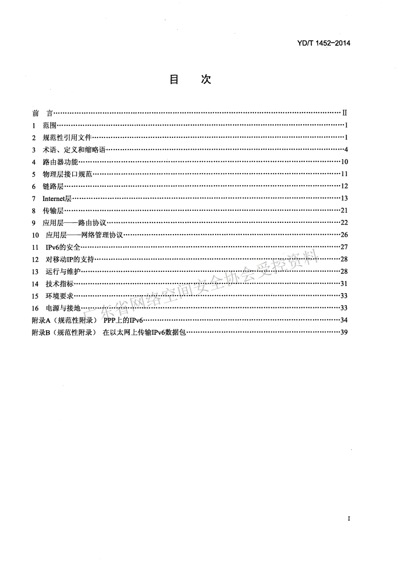 YD-T-1452-2014348072@abc4个月前发布关注私信2.96MB45页050YD-T-1452-2014此内容为付费资源,请付费后查看¥21¥31黄金会员免费钻石会员免费立即购买您当前未登录!建议登陆后购买,可保存购买订单付费资源 第1页 / 共45页 第2页 / 共45页 试读已结束,还剩43页,您可下载完整版后进行离线阅读 THE END标准规范 文本预览 1CS33.040.40M32YD中华人民共和国通信行业标准YD/T1452-2014代替YD/T1452-2006Iv6网络设备技术要求资料东省网边缘路由器Technical specification for edge router equipment supporting IPv62014-10-14发布2014-10-14实施中华人民共和国工业和信息化部发布 查看更多 收起部分 喜欢就支持一下吧收藏