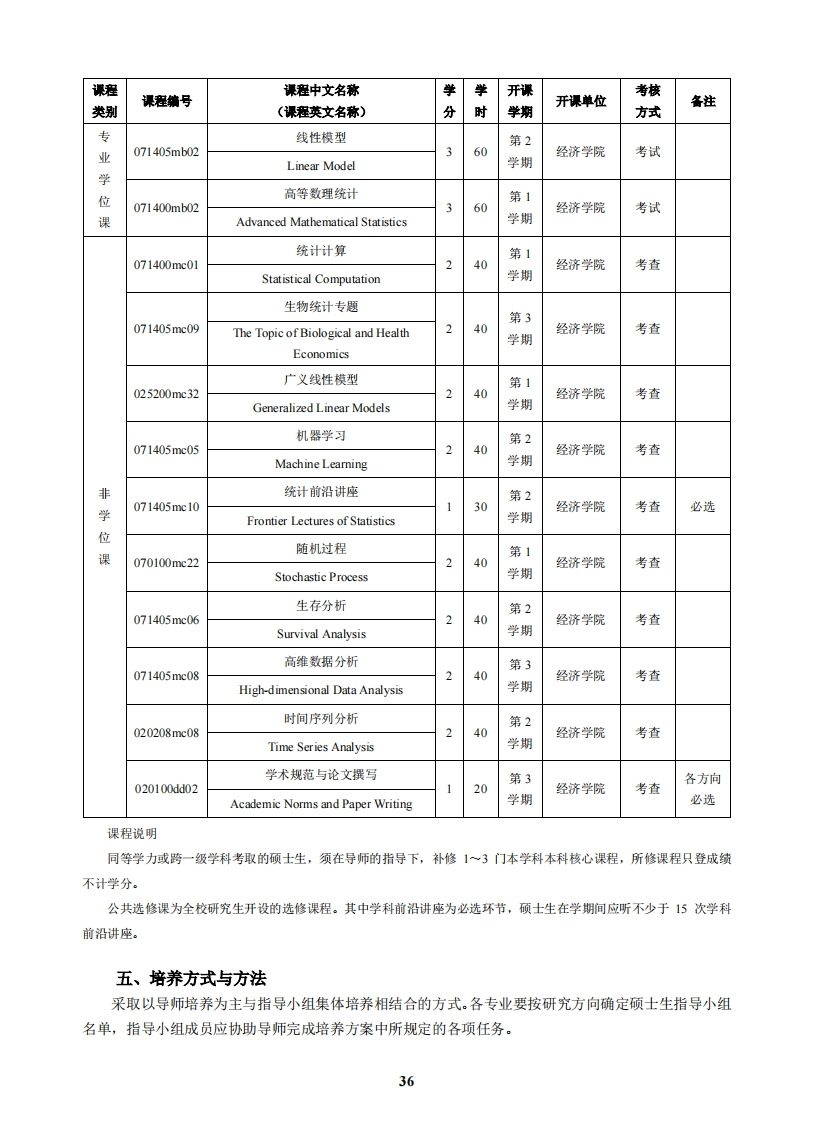 统计学硕士研究生培养方案(代码:0714)一、学科方向L.07140l数理统计学Mathematical Statistics2.071402生物统计学Biological and Health Statistics二、学科简介及培养目标(1)硕士生应成为在本学科上掌握坚实的基础理论与系统的专门知识,掌握】门外国语,具有从事科学研究、教学及管理工作能力的高级专门人才。(2)在港、澳、台地区招收的硕士生,应热爱祖国和中华文化,遵纪守法,品行端正,自觉拥护祖国统一、拥护“一国两制”、为港澳长期繁荣稳定和实现祖国和平统一做贡献的坚定爱国者愿意为祖国和居住地的社会发展作出贡献:在海外招收的华人和其他外国籍硕士生,应热爱中华文化,对中国友好,主动担当中外交流的文化使者,遵纪守法,品行端正,愿为社会发展作出贡献。(3)身心健康。三、学制和学习年限硕士学制3年,最长在学年限5年:硕士生的学习方式分为全日制和非全日制两种。四、课程设置及学分要求本学科要求修满30学分。其中,公共学位课4学分,专业学位课9学分,非学位课17学分。课程课程中文名称学学课程编号开课开课单位考核类别(课程英文名称)分时备注学期方式基础英语第1考试或105590maf140Fundamental English学期外国语学院考查港澳台公中国现代化理论与实践研究第1侨学生马克思主义105590ma23Chinese Modernization Theory236学期考试学院学and Practice Research位汉语第1考试或课105590ma25236华文学院Chinese Language学期考查华人及中国概况留学生105590ma31哈第1考试或国际学院General Introduction of China学期考查专业高等概率论学位第2071405mb0360经济学院考试课Advanced Probability学期35