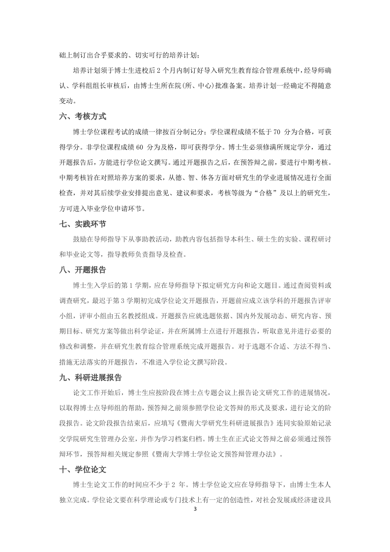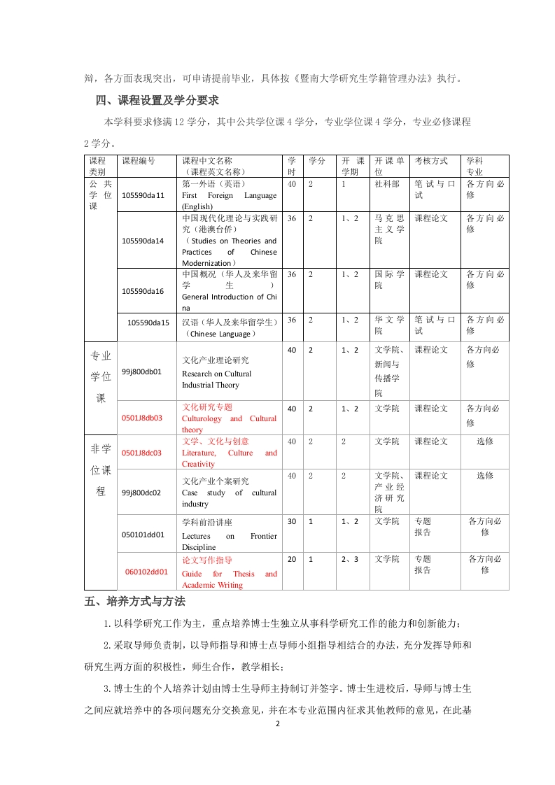 文化创意与文化产业科学学位博士研究生培养方案PhD Program for Cultural Creativity and Cultural Industry(代码:998)(外招)一、培养目标及基本要求(一)培养目标培养掌握坚实宽广的文化产业基础理论和系统深入的专门知识,具有开阔文化视野和研究思维,拥有较强的学术创新能力和较高的科学素养,能够做出推动本学科基础理论发展和现实问题解决的创新性成果,能够独立从事文化产业的科研、教学和实践的高级专门科学人才。(二)基本要求1.港澳台地区博士生,应热爱祖国和中华文化,遵纪守法,品行端正,自觉拥护祖国统一、拥护“一国两制”、为港澳长期繁荣稳定和实现祖国和平统一做贡献的坚定爱国者:海外招收华侨华人和外国籍博士生,应热爱中华文化,对中国友好,主动担当中外交流的文化使者,遵纪守法,品行端正,愿为社会发展作出贡献。2.掌握坚实宽广的文化产业基础理论和系统深入的专业知识,具有独立从事文化产业及其相关领域科学研究和教学工作的能力:3.拥有开阔的文化产业视野和思维,具备跨学科交叉创新的能力,能够在文化产业学科中作出创造性的科研成果,推动科研成果在产业实践中的转化与创新:4.具有较高的科学素养、诚信的学术作风、严谨的学术思维和健康的身心:5.至少熟练掌握1门外语,能够运用外语熟练地进行专业交流。二、方向设置l.文化产业规划与发展研究(Research on planning and development of culturalindustry)2.文化创意与文化管理(Cultural creativity and cultural management)3.文化创意与生活方式研究(Cultural Creativity and Lifestyle Study)三、学制及学习年限学制3年,硕博连读学制为5一6年。博士生的学习年限,根据情况可适当延长,最长不得超过7年。非定向博士如在学习期间提前完成培养计划,通过学位课程考试和学位论文答义