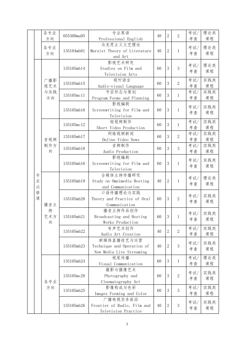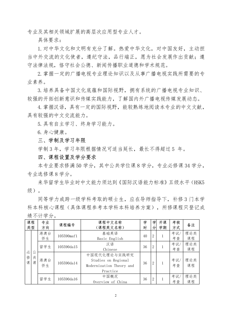 艺术硕士(广播电视)专业学位研究生培养方案(外招)Developing Plan for Master of Fine Arts (MFA)in Radio Television(135105)一、专业方向l.广播影视艺术与实践Theories and Practices of Radio,Film andTelevision Arts2.音视频制作Audio and Video Production3.播音主持艺术Broadcasting and Hosting Arts二、培养目标(一)港澳台生培养德智体美全面发展,具有良好的职业道德和深厚的艺术涵养,扎实的广播电视艺术理论知识,熟练的编剧、策划、创作、剪辑、后期制作等业务技能,从事广播电视、数字媒体创作的应用型、复合型高级专门人才。具体要求:1.热爱祖国和中华文化,自觉拥护祖国统一、拥护“一国两制”,自愿为港澳长期繁荣稳定和实现祖国和平统一做出贡献;遵守法律法规,恪守社会公德、新闻传播职业道德和学术规范;具有国家认同意识、新闻职业理想和社会责任感。2.系统掌握广播电视、数字媒体等基本理论、基本知识和基本方法,具备较高的广播电视艺术修养及艺术创造能力。3.具备广播电视、数字媒体艺术中编剧、策划、创作、后期合成等专业创作能力,并具备参与社会各种艺术活动的组织和管理能力。4.掌握一门外国语,能阅读本专业的外文资料,具有一定的学术交流能力。5.具有自主学习、终身学习能力。6.身心健康。(二)华侨华人及外国留学生培养扎实掌握广播电视专业的基础知识、理论和技能,具备深厚的文化底蕴、宽广的国际视野、良好的艺术素养和精湛的创作能力,能向广播电视