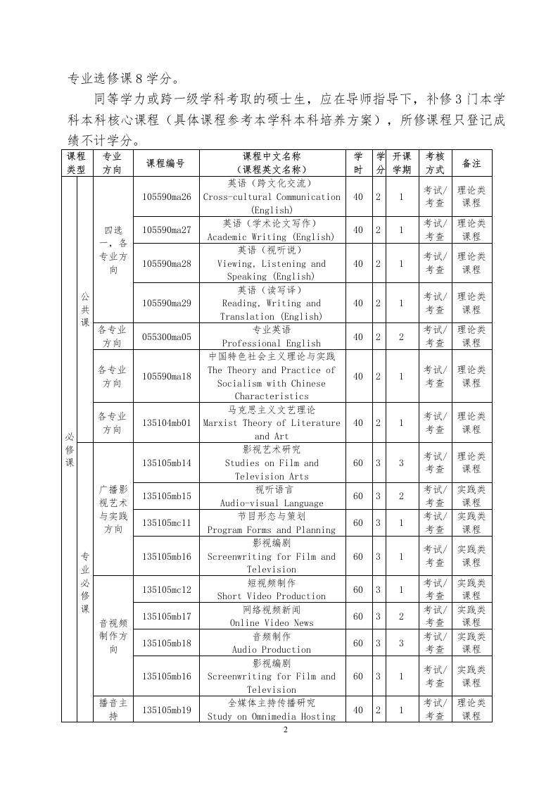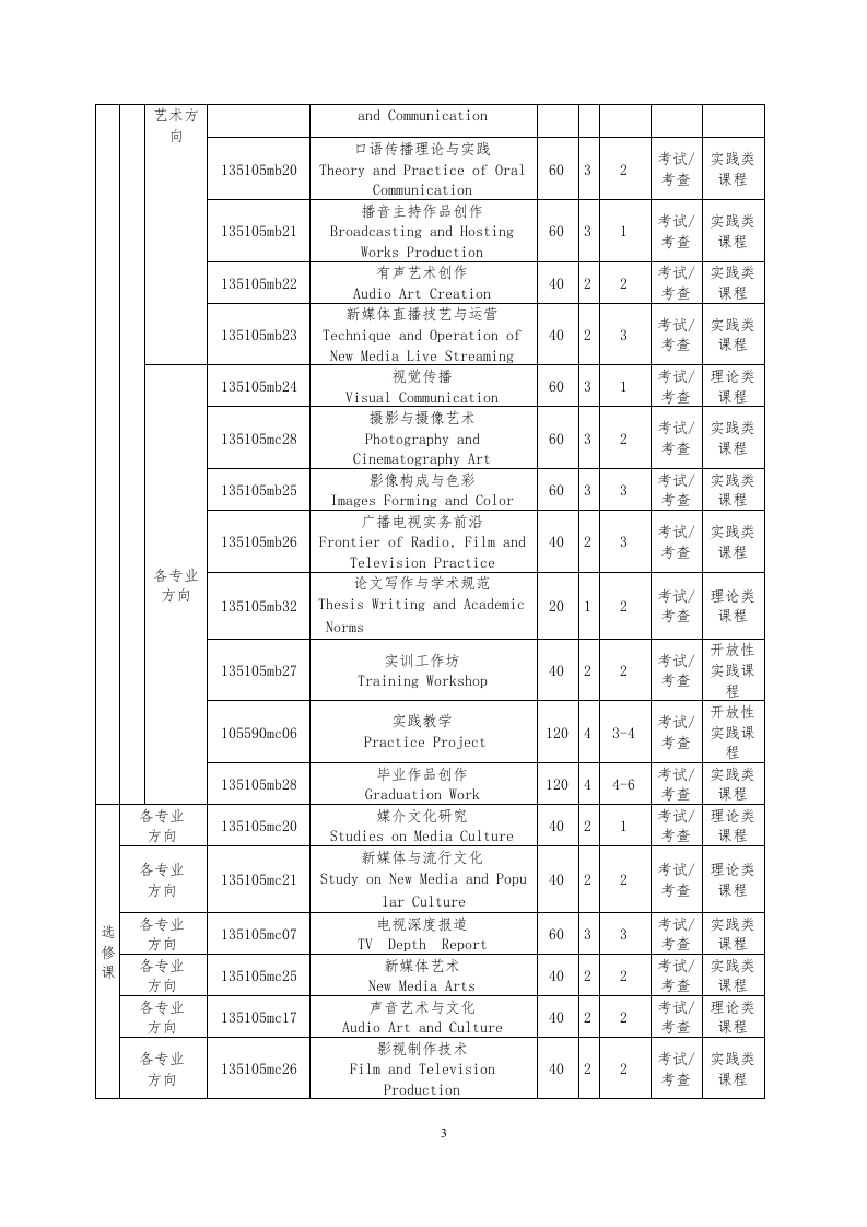 艺术硕士(广播电视)专业学位研究生培养方案(内招)Developing Plan for Master of Fine Arts (MFA)in Radio Television(135105)一、专业方向l.广播影视艺术与实践Theories and Practices of Radio,Film andTelevision Arts2.音视频制作Audio and Video Production3.播音主持艺术Broadcasting and Hosting Arts二、培养目标培养适应新时代中国特色社会主义建设要求,德智体美劳全面发展,并将传统的广播电视艺术理论以及当代视听艺术与实践相结合,服务于广播、电视、短视频、纪录片以及融合媒体产品等文化创意产业,具有社会责任感文化创造力和艺术鉴赏力的复合型、个性化、高层次专业人才。具体要求:(一)坚持马克思主义新闻观,具有良好的政治素养和政策水平;遵守法律法规,恪守社会公德、新闻传播职业道德和学术规范;具有强烈的时代认知和高度的社会责任感;具有正确的新闻志向和价值取向,敢于创新,敏于实践,勇于担当。(二)坚持“人文”“技术”“艺术”三位一体的育人理念。以社会与行业的职业需求为导向,依托新闻传播学科的优势资源,突出“人文+艺术+技术”的学科交叉特色,培养具有广博的人文素养、系统的专业知识、熟练掌握广播电视专题策划和音视频制作以及新媒体艺术产品生产技能的应用型、复合型艺术专门人才。(三)能够运用一门外语,在本专业领域进行必要的对外交流。(四)身心健康。三、学制及学习年限学制3年,学习年限根据情况可适当延长,最长不得超过5年。四、课程设置及学分要求本专业要求修满50学分,其中公共学位课8学分,专业必修课34学分,
