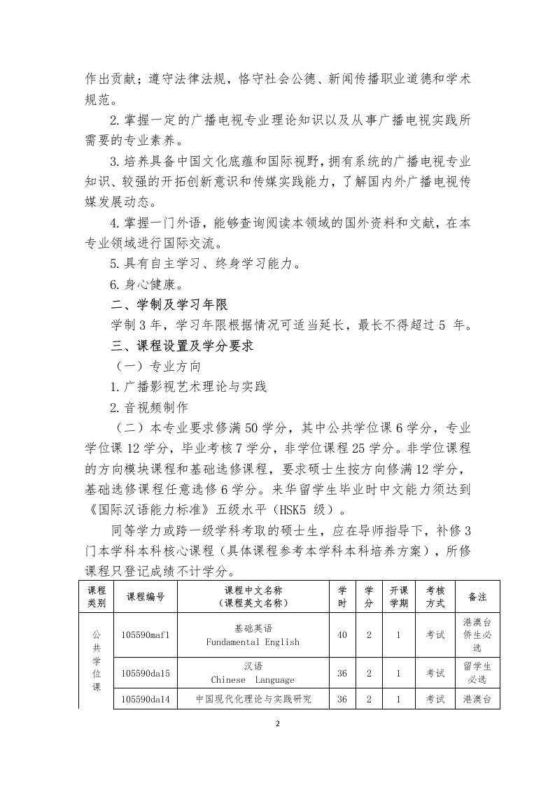 艺术硕士(广播电视)专业学位研究生培养方案(外招)Developing Plan for Master of Fine Arts (MFA)inRadio Television(135105)一、培养目标(一)港澳台生培养德智体美全面发展,具有良好的职业道德和深厚的艺术涵养,扎实的广播电视艺术理论知识,熟练的编剧、策划、创作、剪辑、后期制作等业务技能,从事广播电视、数字媒体创作的应用型、复合型高级专门人才。具体要求:1.热爱祖国和中华文化,自觉拥护祖国统一、拥护“一国两制”,自愿为港澳长期繁荣稳定和实现祖国和平统一做出贡献;遵守法律法规,恪守社会公德、新闻传播职业道德和学术规范;具有国家认同意识、新闻职业理想和社会责任感。2.系统掌握广播电视、数字媒体等基本理论、基本知识和基本方法,具备较高的广播电视艺术修养及艺术创造能力。3.具备广播电视、数字媒体艺术中编剧、策划、创作、后期合成等专业创作能力,并具备参与社会各种艺术活动的组织和管理能力。4.掌握一门外国语,能阅读本专业的外文资料,具有一定的学术交流能力。5.具有自主学习、终身学习能力。6.身心健康。(二)华侨华人及外国留学生培养扎实掌握广播电视专业的基础知识、理论和技能,具备深厚的文化底蕴、宽广的国际视野、良好的艺术素养和精湛的创作能力,能向广播电视专业及其相关领域扩展的高层次应用型专业人才。具体要求:1.对中华文化和文明有充分了解。热爱中华文化,对中国友好,主动担当中外交流的文化使者,遵纪守法,品行端正,愿为社会发展