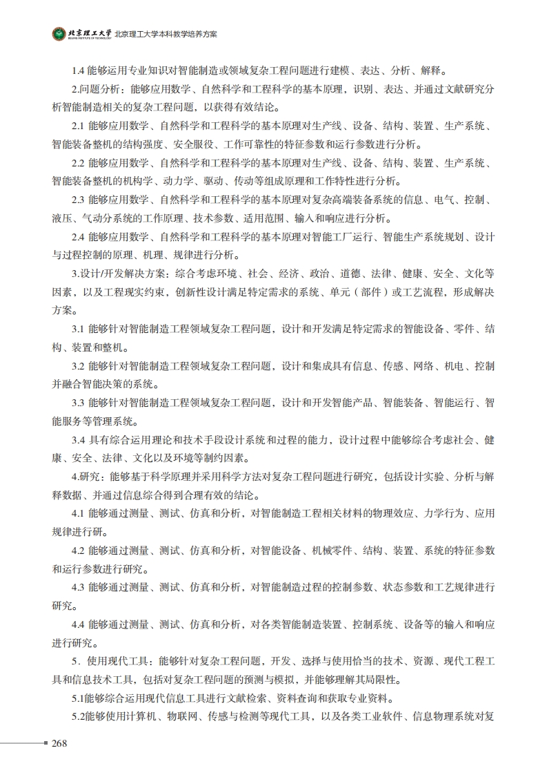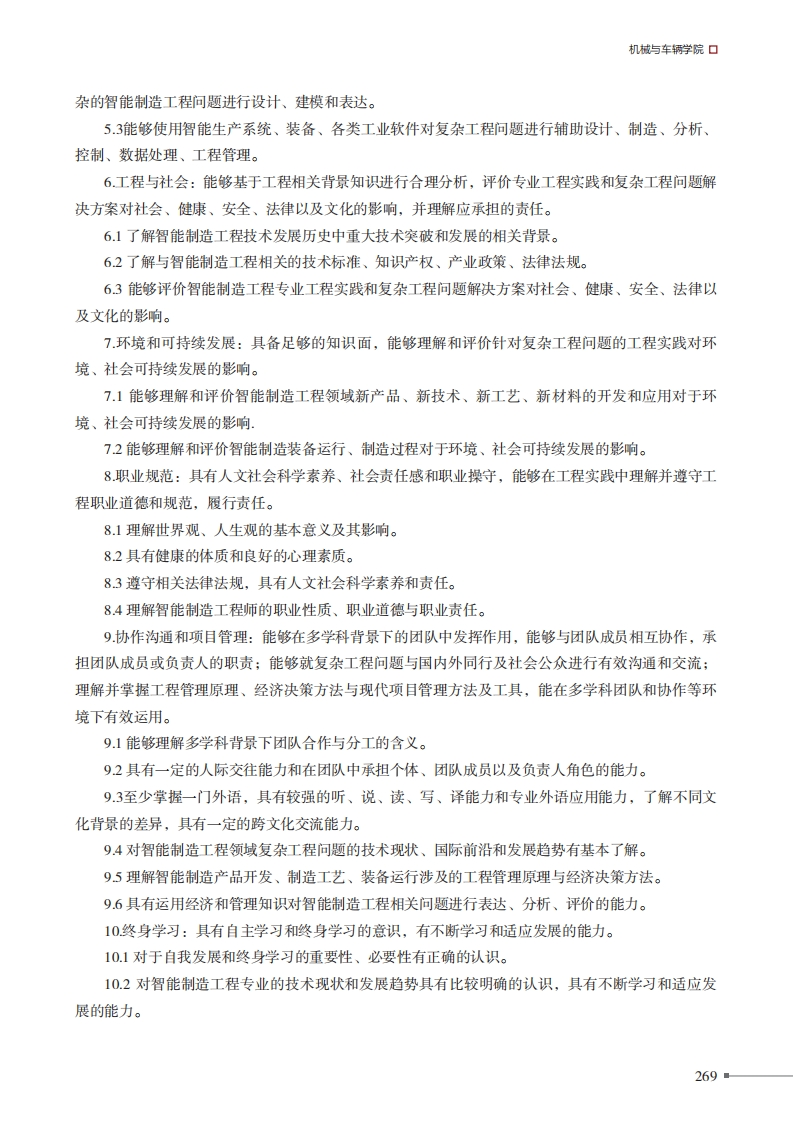 机械与车辆学院口智能制造工程专业培养方案一、专业培养日标本专业面向智能制造学科未来发展,国家制造强国战略需求,培养多元化、创新型的卓越领军领导人才。1.1总体目标1.多元化知识体系:本专业毕业生要具有宽广的专业基础知识和深厚的数理功底,形成跨机械制造、计算机、自动化、工程与管理等多个专业的知识体系;2.创新精神与实践能力:本专业毕业生要具备创新精神、国际视野与系统思维,精通智能制造技术,能够综合运用数理工管多学科专业知识,解决复杂工程问题的能力;3卓越领军领导能力:能够解决领域未来重大科学问题,为学科发展与科技创新做出重大贡献:能够在国家重大工程项目中发挥核心作用,成为国家未来发展的栋梁之才。1.2具体目标本专业学生毕业后5年左右,预期达到以下具体目标:(1)具有高尚的职业道德和深厚的人文科学素养:(2)能有效运用数字化、智能化技术与制造工程技术规范设计智能制造或相关机械工程领域的技术解决方案;(3)能在多学科交叉、跨专业领域团队中与人协作,并具备较强的组织协调与团队领导能力:(4)在与智能制造工程或相关专业领域内成功就业或继续深造攻读更高学位;(5)能够形成终身学习的意识,具有不断自主学习和适应社会发展的能力:(6)具有国际交流、合作能力和能为当地、本国及全球社会服务的能力。二、毕业要求1.工程知识:能够综合运用数学、自然科学、工程基础和多学科专业知识解决智能制造相关的复杂工程问题。1.1能够运用数学知识对智能制造领域复杂工程问题进行建模、表达、分析、计算、求解:12能够运用自然科学知识对智能制造领域复杂工程问题进行建模、表达、分析、解释:13能够运用工程基础知识对智能制造或领域复杂工程问题进行建模、表达、分析、解释;267