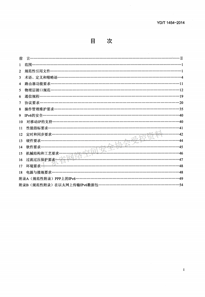 YD-T-1454-2014348072@abc4个月前发布关注私信3.85MB60页021YD-T-1454-2014此内容为付费资源,请付费后查看¥21¥31黄金会员免费钻石会员免费立即购买您当前未登录!建议登陆后购买,可保存购买订单付费资源 第1页 / 共60页 第2页 / 共60页 试读已结束,还剩58页,您可下载完整版后进行离线阅读 THE END标准规范 文本预览 1CS33.040.40M32YD中华人民共和国通信行业标准YD/T1454-2014代替YD/T1454-2006受控资料IPv6网络设备技术要·东省网核心路由器Technical specification for core router equipment supporting IPv62014-10-14发布2014-10-14实施中华人民共和国工业和信息化部发布 查看更多 收起部分 喜欢就支持一下吧收藏