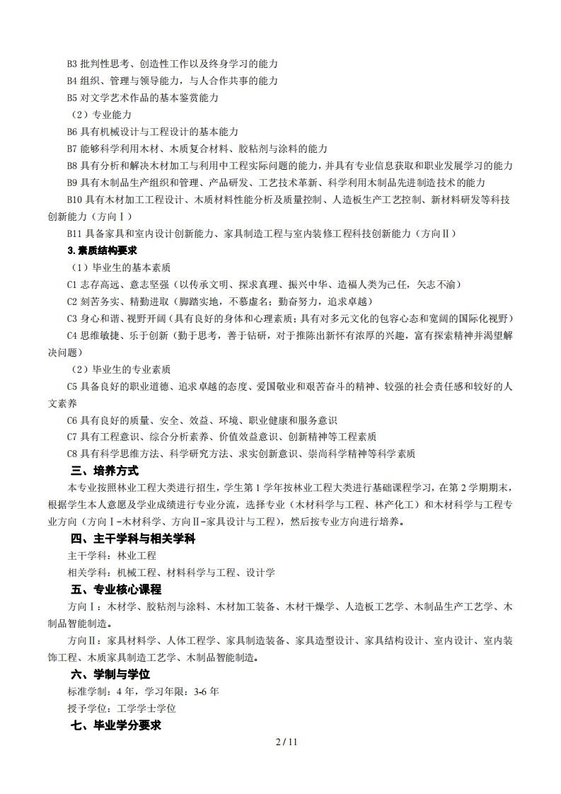 木材科学与工程专业培养方案专业代码:082402专业名称:木材科学与工程一、培养目标1.基本培养目标培养的学生身心健康、知识结构合理,有健全的人格、高尚的人文情怀和社会责任感,有一定的批判思维与创新能力、科学研究能力、沟通交流能力、终身学习能力和组织管理能力,具有国际视野和团队合作精神。2.专业培养目标培养具有扎实工科理论基础、系统掌握木材及木质复合材料性能及其现代生产技术与装备、家具及木制品设计与智能制造等方面的基础理论与专业知识、具有较强的专业综合实践能力、产品及工程设计能力、生产组织能力和创新创业能力,能在木材及木质复合材料加工制造、家具设计与制造等领域从事科学研究、工程设计、产品开发、生产管理与经营、检验与贸易等工作的创新型与复合型技术领军人才。二、毕业要求1.知识结构要求(1)毕业生应掌握的基本知识A1历史、哲学、文学、艺术等领域的基本知识(培养学生具有正确的历史观、世界观、人生观、价值观审美观)。A2社会科学学科研究方法的基本知识(让学生掌握社会科学的基本知识,了解基本研究方法,具有人文情怀和社会责任感)A3数理与逻辑分析的基础知识(让学生掌握数学、物理学以及逻辑分析的基本知识)A4现代信息技术的基本知识(让学生掌握现代网络技术、通信技术和信息处理技术等的基本知识)A5生态环境、生命科学、经济管理等方面的基本知识(让学生掌握生态环境与人类命运、科技创新与社会发展、农业发展与政策法规、传统文化与世界文明等方面的基本知识)(2)毕业生应掌握的专业知识A6掌握扎实的化学、机械、电子、计算机等工程基础知识A7掌握木材、木材加工装备的工作原理及其应用的基础理论与基本知识A8掌握家具设计的基本理论、木制品与家具的生产工艺及智能制造技术、木制品质量控制技术等专业基本知识A9掌握木材切削理论、胶粘剂与涂料的性能与利用、木材干燥技术、人造板及木质复合材料生产技术、木材加工工程设计等方面的基本知识(方向I)A10掌握室内设计与装饰装修工程的基本理论和基本知识(方向Ⅱ)2.能力结构要求(1)基本能力B1清晰思考和用语言文字准确表达的能力B2发现、分析和解决问题的能力1/11