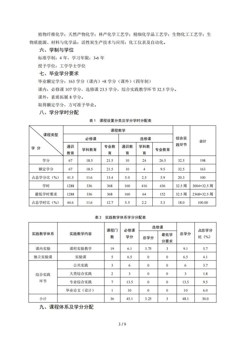 林产化工专业培养方案专业代码:082403专业名称:林产化工一、培养目标1.基本培养目标培养德智体美劳全面发展、理想信念坚定的社会主义建设者和接班人。学生应具备健全的人格、合理的知识结构、高尚的人文情怀和“三农”情怀:有一定的批判思维与创新能力、初步的科学研究能力、团队合作精神、组织管理能力和终身学习能力:具有国际视野以及服务国家现代化建设和民族复兴的社会责任感。2.专业培养目标培养具有扎实的化学化工相关基础理论与技能,能在林产资源化学加工、生物化学品加工、生物质能源与材料、精细化学品加工技术和工艺设计等领域从事产品开发与过程设计、生产经营管理、科研创新工作的高素质专业人才和学术精英。二、毕业要求1.知识结构要求(1)毕业生应掌握的基本知识A1历史、哲学、文学、艺术等领域的基本知识(培养学生具有正确的历史观、世界观、人生观、价值观、审美观)。A2社会科学学科研究方法的基本知识(让学生掌握社会科学的基本知识,了解基本研究方法,具有人文情怀和社会责任感)A3数理与逻辑分析以及物理学的基础知识(让学生掌握数理与逻辑分析、大学物理的基本知识)A4现代信息技术的基本知识(让学生掌握现代网络技术、通信技术和信息处理技术等基本知识)A5生态环境、生命科学、经济管理等方面的基本知识(让学生掌握生态环境与人类命运、科技创新与社会发展、农业发展与政策法规、传统文化与世界文明等方面的基本知识)(2)毕业生应掌握的专业知识A6掌握专业所需的天然产物化学、植物纤维化学、无机及分析化学、有机化学及物理化学等学科的基础知识:A7掌握仪器分析的基本原理与方法,了解光谱分析、色谱分析等现代分析方法和手段:A8掌握天然植物资源化学转化和生物转化的技术原理与方法:A9掌握天然植物资源化学和生物化学加工过程工艺设计、加工设备设计和选型、工厂设计等知识与技能:1/9