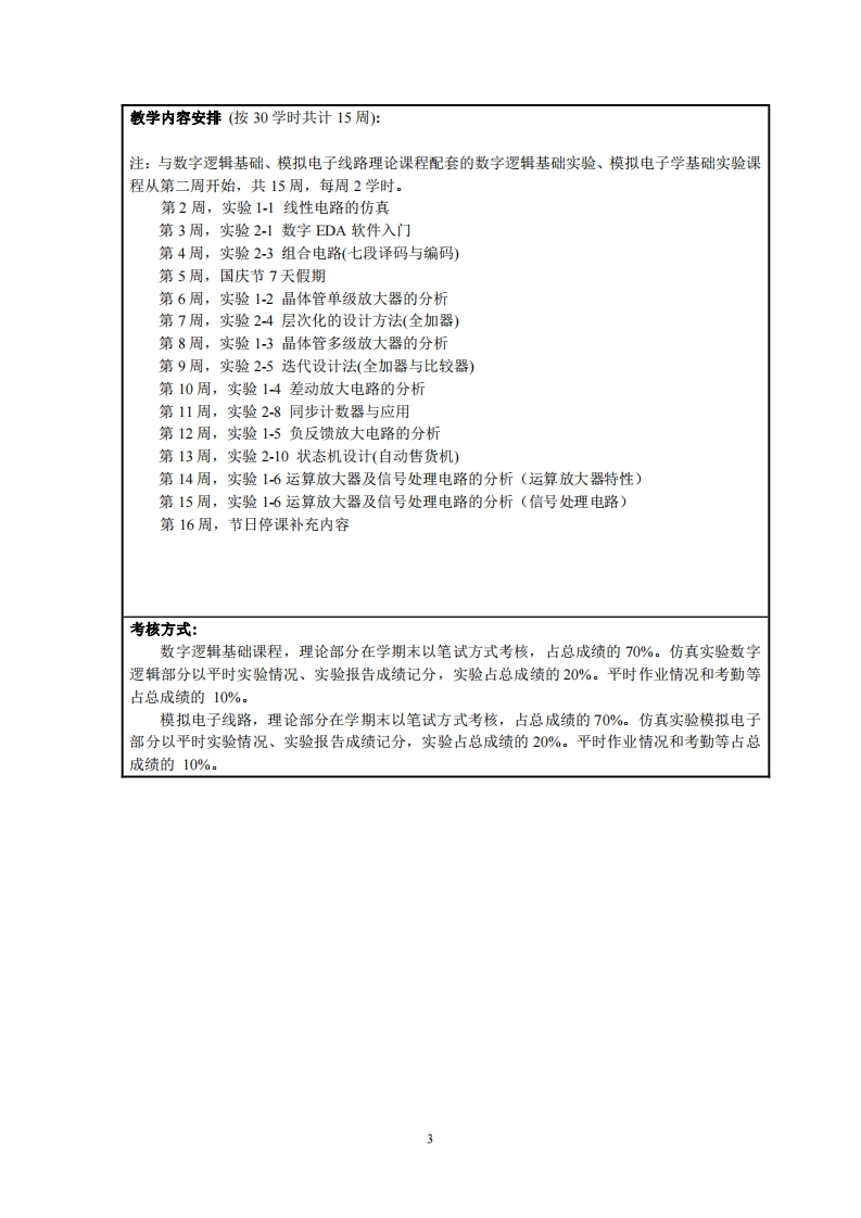 复旦大学课程教学大纲课程名称课程代码NF0120010.01,02,03,04,06编写时间2016年3月17日星期四课程名称数字逻辑基础实验英文名称Essential Experiment of Digital Logic学分数0.0周学时开课院系信息科学与工程学院任课老师孔庆生、赵燕、郭羿、马煜、秦亚杰、陶新萱预修课程无课程性质专业必修课程《数字逻辑基础实验》是复旦大学自2003年2月起为实施理科技术类平台课程计划而开设的基础实验课程,教学对象为理论课程《数字逻辑基础》、《模拟电子线路》的同时选课学生。基础实验教学采用与理论课程进程并行的双学期制,教学目的时间安排为从每学期第2周开始至期末,每周2学时,每学期30学时。结合理论课程而开设的电路基础实验课程,能够以有限的课时,使学生通过波形观察、电路参数与现象的对应关系比较,促进对理论知识的学习。数字逻辑基础实验内容包括数字EDA软件入门、组合电路的分析和验证、组合电路(七段译码器与编码器)的设计、层次化的设计方法(全加器设计)、迭代设计法(4位全加器与数据比较器的设计)、算术逻辑单元的设计、触发器及基本应用电基本内容简路、同步计数器与应用、顺序脉冲信号发生器、状态机设计(自动售货机)、交通灯介控制器等十一个实验。模拟电子学基础实验内容包括线性电路分析、双极型管与场效应管单级放大器分析、多级放大器分析、差动放大器分析、负反馈放大器分析、信号处理电路分析、信号发生器分析、直流电源分析等八个实验。教材和教学参考资料作者书名出版社出版日期孔庆生模拟与数字电路基础实验复旦大学2014/9教材和陈光梦数字逻辑基础(第三版)复旦大学2009/12教学参考资陈光梦复旦大学料模拟电子学基础2012/4康华光电子技术基础模拟部分(第五版)高等教育2005/7阎石数字电子技术基础高等教育2002