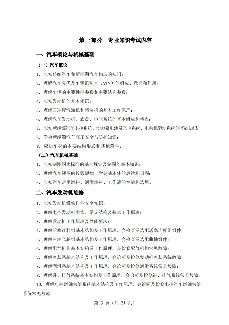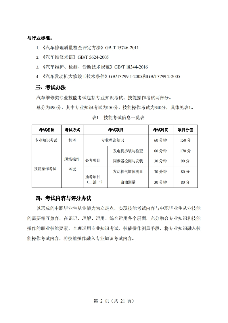 2024年湖北省普通高等学校招收中等职业学校毕业生技能高考汽车维修类技能考试大纲(湖北省技能高考汽车维修类专业委员会制定)一、考试性质2024年湖北省普通高等学校招收中等职业学校毕业生技能高考,是由中等职业学校(包括中等专业学校、职业高中、技工学校和成人中专)相关专业毕业生参加的选拔性考试,汽车维修类技能考试的专业知识、技能操作考试,应当具有一定的信度、效度和必要的区分度。二、考试依据(一)依据《国家职业技能标准2014年修订)》(人社厅发〔2014)62号,2014年5月9日公布施行)。1.职业(工种)名称:汽车维修工(1)职业定义:使用工、夹、量具,仪器仪表及检修设备进行汽车的维护、修理和调试汽车的人员。(2)职业等级:初、中级(国家职业资格五级、四级),职业编码:4-12-01-01(3)职业能力特征:具有一定的学习、计算和表达能力:具有一定的空间感和形体知觉:手指、手臂灵活,动作协调。(二)参照首批《中等职业学校专业教学标准(试行)》中华人民共和国教育部公布(教职成厅函〔2014)11号);第二批《中等职业学校专业教学标准(试行)》(教职成厅函(2014)48号)。1.中等职业学校汽车制造与检测专业教学标准,专业代码:660701:2.中等职业学校汽车电子技术应用专业教学标准,专业代码:660703:3.中等职业学校汽车运用与维修专业教学标准,专业代码:700206:(三)《湖北省职业教育汽车运用与维修技术专业中高职衔接教学标准(试行)》,湖北省教育厅,2016年12月27日。(四)《中华人民共和国标准化法》最新颁布施行的汽车维修质量检验技术国家标准第1页(共21页)