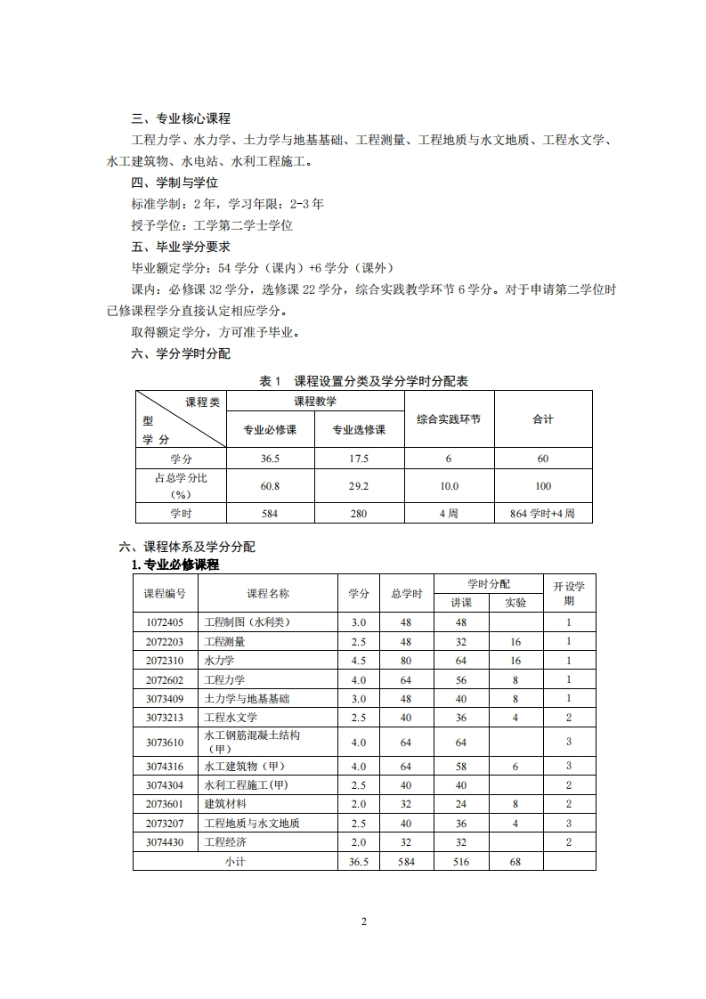 水利水电工程专业(第二学士学位)培养方案专业代码:081101专业名称:水利水电工程一、培养目标1.基本培养目标培养思想品德高尚、社会责任感和创新意识强烈、人格健全、知识结构合理、身心健康的高素质人才,具有良好的沟通交流能力、自我学习能力、组织管理能力、团队合作精神、人文情怀和创新思维意识,有深厚爱国情怀和国际视野。2.专业培养目标培养具有水利工程学科的基础理论、基本知识、专业技能以及新工科意识,能在水利水电工程及相关领域从事勘测、规划、设计、施工、运行、科研和管理工作的专门人才。二、毕业要求毕业生要具备水利工程专业学科知识,以及多学科知识为支撑的知识体系,具有解决复杂工程问题的能力,以及多方面素质协调发展的实践能力。具体要求说明如下。1.工程知识:掌握水利工程学科所必须的工程基础、计算机、经济、法律、水利水电、环境等相关领域知识,并能应用于解决水利水电工程的工程问题。2.问题分析:能够掌握问题分析的思路与方法,能够运用数学、自然科学、工程基础和专业知识,并结合文献检索,分析水利水电工程及相关领域的工程问题,进行正确识别与表达。3.设计/开发解决方案:能够针对水利水电工程规划、建设、运行和管理中相关复杂工程问题,并充分考虑社会、环境、安全、法律、文化等因素的影响,提出具有创新意识且切实可行的解决方案,并根据相关规范进行方案设计。4.工程与社会:运用专业知识及本专业相关领域的方针政策、法律法规和行业规范,正确分析和评估水利水电勘测、规划、设计、施工、运行中相关复杂工程解决方案对社会、健康、安全、法律以及文化的影响,并理解和接受应承担的责任。5.环境和可持续发展:能够理解和科学评价水利水电工程建设与运行对环境和生态保护、以及对社会可持续发展的影响。6.职业规范:具有强烈的事业心、奉献精神和家国情怀,具有较高的人文社会科学素养、社会责任感,能够在工程实践中理解并遵守工程职业道德和规范,遵纪守法。7.交流沟通:能够就水利水电复杂工程问题与业界同行及社会公众进行有效的沟通和交流,包括撰写报告和设计文稿、陈述发言、清晰表达或回应指令。至少掌握一门外语,并具备一定的国际视野,能够在跨文化背景下进行沟通和交流。8.工程项目管理:具有管理、经济和法律等一些社会科学领域的知识背景,掌握水利工程项目建设程序与管理办法,效益评估、立项决策方法以及运行管理体制,具备较强的管理能力。9.终身学习:对社会进步的规律和新技术有一定认识,具有自主学习和终身学习的意识,具有不断学习和适应未来发展的能力。