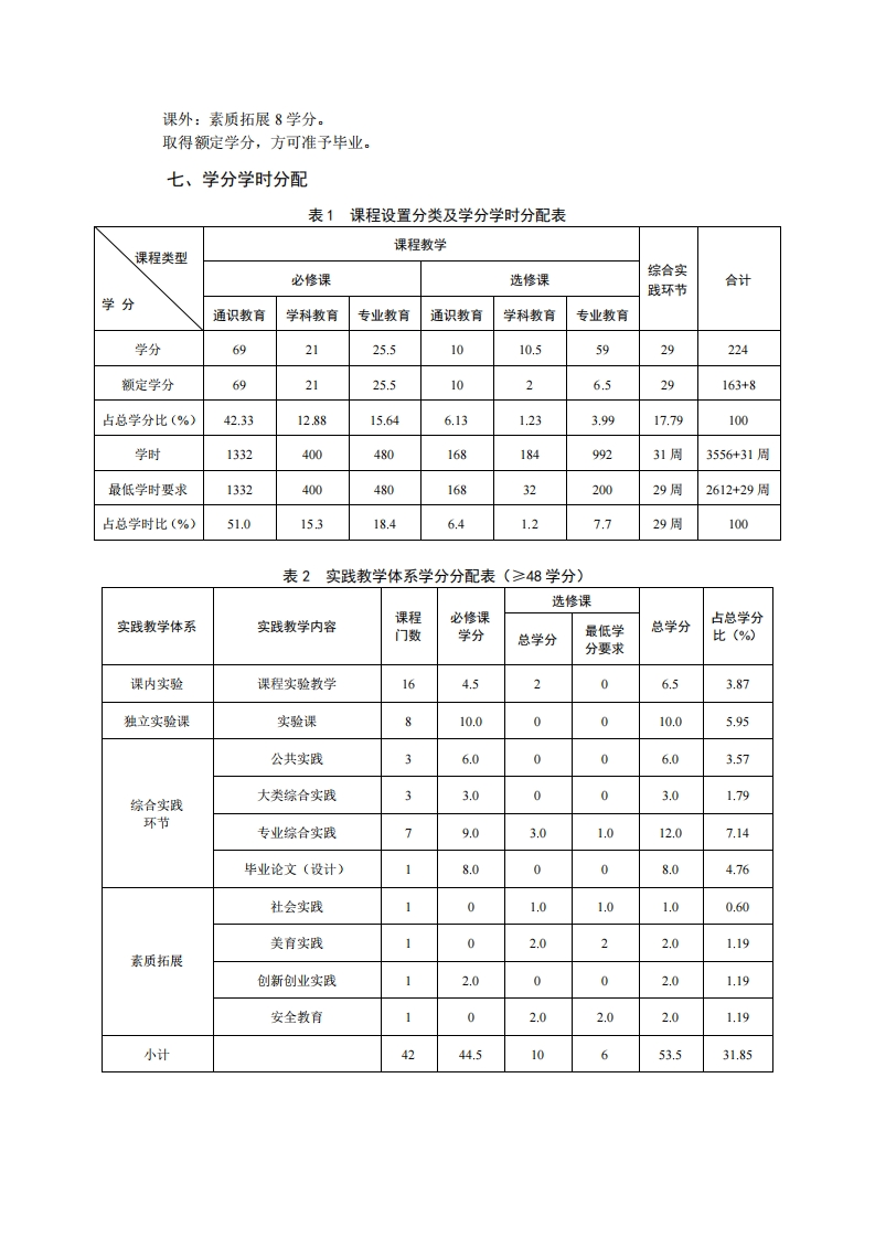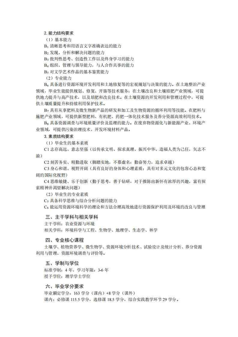 资源环境科学专业培养方案专业代码:082506T专业名称:资源环境科学一、培养目标1.基本培养目标培养的学生身心健康、品德优良、知识结构合理,具有健全的人格、高尚的人文情怀和强烈的社会责任感,有一定的批判思维,具备较强的发现和解决问题能力、科研创新能力、语言文字表达能力、终身学习能力和组织管理能力,具有深厚的爱国情怀、开阔的国际视野和良好的团队协作精神,德智体美劳全面发展。2.专业培养目标立足西北,面向全国,响应资源高效利用和生态环境绿色发展的国家需求,培养资源环境科学领域拔尖创新型与复合应用型人才,重点服务于我国可持续农业生产与生态环境建设。要求学生扎实地掌握本专业的基本理论、方法和技术,具有综合运用所学知识和技能从事土壤、土地、肥料、水、生物等资源的开发、利用与管理,环境质量分析及评价工作的能力和素质。毕业生可在土壤改良培肥、肥料生产与施用、微生物制剂、农业废弃物处理与农村环境整治、污染与退化土地修复治理、国土开发与整治等产业从事研发、规划设计、管理和技术推广工作或创业:在土、肥、水、生物资源利用及技术推广、环境保护和环境监理、生态环境保护等行政和事业单位从事管理和技术推广工作:在高等院校或科研单位从事相关的教学、科研或管理工作。二、毕业要求1.知识结构要求(1)毕业生应掌握的基本知识A1历史、哲学、文学、艺术等领域的基本知识(培养学生具有正确的历史观、世界观、人生观、价值观、审美观)。A2社会科学学科研究方法的基本知识(让学生掌握社会科学的基本知识,了解基本研究方法,具有人文情怀和社会责任感)A3数理与逻辑分析以及物理学的基础知识(让学生掌握数理与逻辑分析、大学物理的基本知识)A:现代信息技术的基本知识(让学生掌握现代网络技术、通信技术和信息处理技术等的基本知识)A5生态环境、生命科学、经济管理等方面的基本知识(让学生掌握自然环境与社会发展、经济管理与社会科学、科技发展与文明传承、文明对话与国际视野等方面的基本知识)(2)本科生应掌握的专业知识A6土壤、肥料和生物等资源的高效利用、植物生产的优化条件、生态环境建设和保护等基础理论知识。A,土壤、植物、肥料、环境分析技能和生态障碍的诊断修复技术,能够利用地理信总技术实现资源环境信总采集与管理。Ag肥料及微生物新产品的研发和加工、生物资源的循环利用和土地资源评价与整理等相关知识和技能。