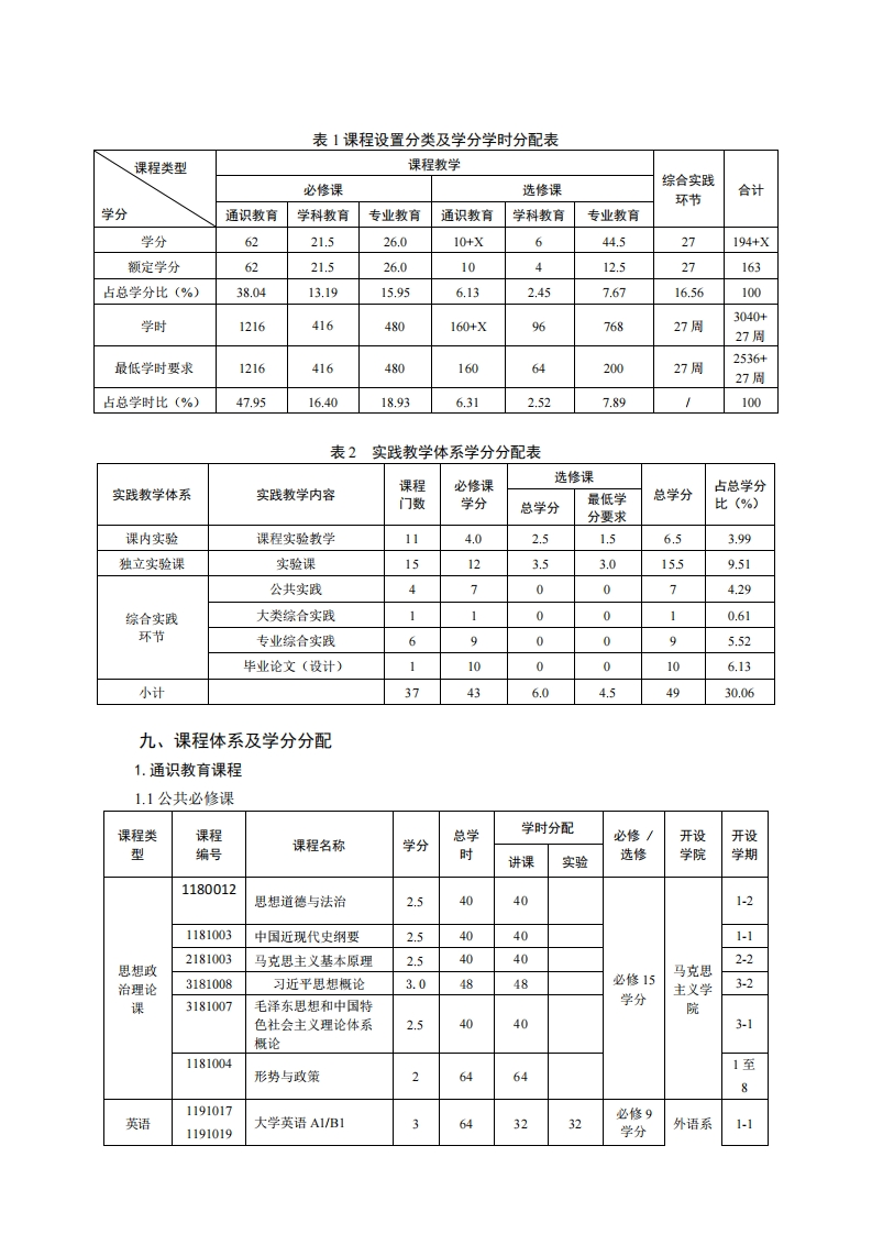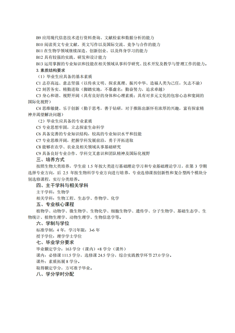 生物科学专业培养方案(2019版)专业代码:071001专业名称:生物科学一、培养目标1.基本培养目标培养的学生德、智、体、美、劳全面发展,有健全的人格、身心健康、知识结构合理,具有坚定的理想信念、社会责任感和高尚的人文情怀,有一定的批判性思维与创新能力、科学研究能力、沟通交流能力、终身学习能力和组织管理能力,具有国际视野和团队合作精神。2.专业培养目标以掌握现代生命科学理论和技术为核心,培养学生具有扎实生物学基础理论、基本知识和基本技能,了解生命科学发展动态,在现代生物学研究方法、实验技术和科学思维等方面受到良好训练,能在生命科学及相关领域从事科学研究、技术研发、教学与管理工作的创新型或复合应用型人才。为其成为生命科学领域的学术精英或技术领军人才奠定坚实的基础。二、毕业要求1.知识结构要求(1)毕业生应掌握的基本知识A1历史、哲学、文学、艺术等领域的基本知识A2社会科学与研究方法的基本知识A3数理与逻辑分析以及物理学的基础知识A4现代信总技术的基本知识A5生态环境、农业发展、经济管理等方面的基本知识(2)毕业生应掌握的专业知识A6具备扎实的植物学、动物学、微生物学、生物化学、遗传学、分子生物学、细胞生物学、植物生理学、动物生理学、生态学等生物学基础课程的基础理论和基本知识A7掌握生物科学相关分支学科的基础理论、技术和研究进展A8掌握现代生物科学基础研究、应用研究和技术研发等方面的知识和技术A9了解现代生命科学与技术的产业化发展动态和应用前景A10掌握农学、农林经济管理等方面的一般知识A11掌握生物安全、生命伦理及相关的基本知识2.能力结构要求(1)毕业生应具备的基本能力B1清晰思考和用语言文字准确表达的能力B2发现、分析和解决问题的能力B3批判性思考、创造性工作以及终身学习的能力B4组织、管理与领导能力,与人合作共事的能力B5对文学艺术作品的基本鉴赏能力(2)毕业生应具备的专业能力B6扎实的生物学基本实验技能B7运用现代技术对生物信息进行储存、检索和分析,对核酸、蛋白质等生物大分子进行分离、纯化和检测的能力B8生物学实验设计、论文写作和学术交流的能力