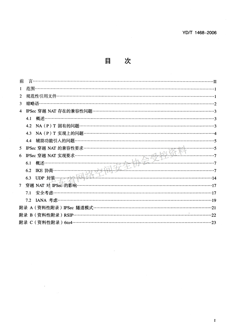YD-T-1468-2006348072@abc4个月前发布关注私信2.09MB27页026YD-T-1468-2006此内容为付费资源,请付费后查看¥21¥31黄金会员免费钻石会员免费立即购买您当前未登录!建议登陆后购买,可保存购买订单付费资源 第1页 / 共27页 第2页 / 共27页 试读已结束,还剩25页,您可下载完整版后进行离线阅读 THE END标准规范 文本预览 1CS33.040.40YD中华人民共和国通信行业标准YD/T1468-2006IP安全协议(IPSec)穿越网络地址翻译(NAT技术要求日女Technical Requirements of IPSec Traverse NAT广东省2006-06-08发布2006-10-01实施中华人民共和国信息产业部发布 查看更多 收起部分 喜欢就支持一下吧收藏