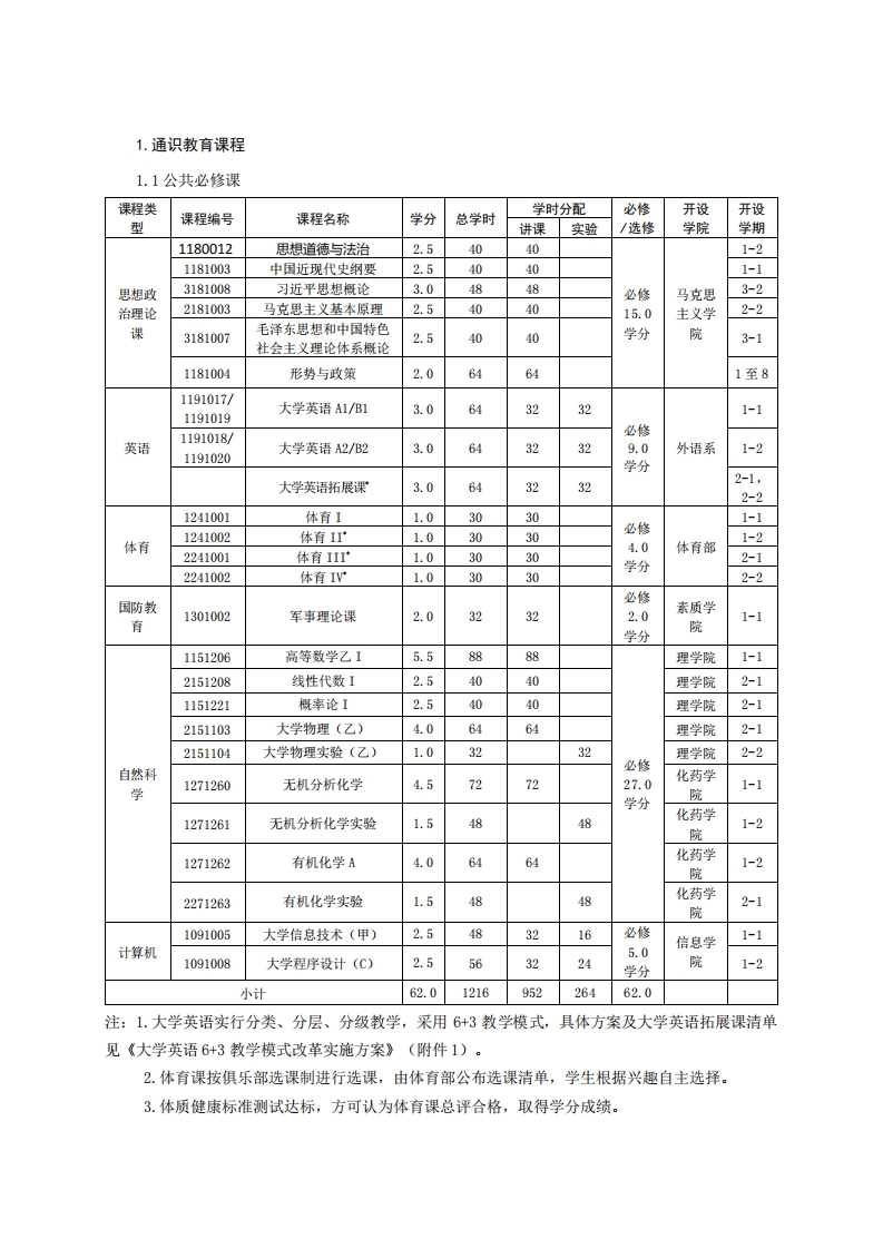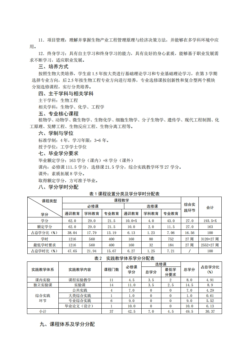 生物工程专业培养方案(2019版)专业代码:083001专业名称:生物工程一、培养目标1.基本培养目标培养的学生德、智、体、美、劳全面发展,有健全的人格、身心健康、知识结构合理,具有坚定的理想信念、社会责任感和高尚的人文情怀,有一定的批判性思维与创新能力、科学研究能力、沟通交流能力、终身学习能力和组织管理能力,具有国际视野和团队合作精神。2.专业培养目标培养的学生具备扎实的现代生命科学理论和工程学基础,系统地掌握现代生物技术及其产业化的科学原理、工艺技术过程及工程设计的基本理论和实践技能,了解生物工程学科前沿发展动态,能在生物产业和生物工程领域从事科学研究、新技术与新产品研发、工程设计和生产管理等工作,成为具有较高的科研能力、创新能力和工程素质的生物技术与工程领域复合应用型人才和创新创业的技术领军人才。二、毕业要求1.工程知识:掌握数学、自然科学、工程基础和生物技术与工程专业知识,能够运用其原理和方法解决生物产业中的复杂工程问题。2.问题分析:能够应用数学、自然科学和生物技术与工程的基本原理和方法,识别、表达、并通过文献研究分析生物产业中的复杂工程问题,获得有效结论。3.设计、开发解决方案:综合运用生物技术与工程专业知识设计解决生物产业中复杂工程问题的技术、工艺、系统及单元,在设计环节中体现创新意识,并充分考虑社会、健康、安全、法律、文化以及环境等因素。4.研究:能够基于自然科学和生物技术与工程的科学原理并采用科学方法对生物制造的复杂工程问题进行研究,通过设计实验、获得、分析与解释数据,比较综合后得到合理有效的结论。5.使用现代工具:能够针对生命科学和生物产业中的复杂工程问题,开发、选择和使用现代科学仪器、工程工具和先进的信息技术工具,能对复杂工程问题进行模拟、分析及预测,并理解其局限性。6.工程与社会:熟悉生物工程及其产业的相关政策和法规,能够基于生物工程及相关知识进行合理分析,评价生物技术与工程实践和复杂工程问题解决方案对社会、健康、安全、法律以及文化的影响,并理解应承担的责任。7.环境和可持续发展:能够理解和评价通过生物工程实践解决复杂工程问题对工业、农业、环境、社会可持续发展等的影响。8.。职业规范:具有高尚的人文社会科学素养、社会责任感,能够在生物工程实践中理解并遵守工程职业道德和规范,履行责任。9.个人和团队:能够在工业、农业、服务业等多行业、多学科背景下的团队中承担个体、团队成员以及负责人角色,能够协作完成综合性实践项目。10.沟通:能够就复杂生物与技术工程问题和业界同行及社会大众进行有效沟通和交流,能够撰写报告、设计方案、陈述发言、清晰表达或回应指令,掌握一门外语,具有一定的国际视野,能够顺利开展跨文化沟通和交流的能力。