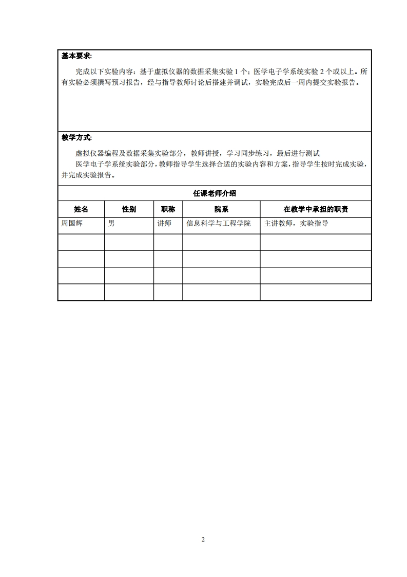 复旦大学课程教学大纲课程代码编写时NF0130019间2016年2月课程名称生物医学工程专业实验(下)英文名称Experiments of Biomedical Engineering (Part II)学分数3周学时3开课院系信息科学与工程学院任课老师周国辉预修课程模拟电子线路:数字逻辑基础:高频电子线路:模拟与数字电路实验:工程生理学课程性质理科专业实验通过专业实验教学,使学生能够应用电子学、计算机数据采集与分析的方法,对生理信号进行测量与处理:对医疗器械(如心脏起搏器)进行检测,或实现其基本功敏学目的能。从而起到扩大视野,提高动手能力和独立解决问题能力的作用。作为生物医学工程专业实验(上)的延续,内容及难度都有所增加。为保证课程的连贯性,本课程以专业实验(上)的医学电子学系统实验作为实验内容的一部分:并增加了虚拟仪器及数据采集,虚拟仪器在医学电子学中的应用,以及自选实基本内容简验内容等。具体包括:介A.虚拟仪器编程及数据采集实验(练习与测试,动手实验):B.医学电子学系统实验(心电R波模拟,生理信号的调制与解调,心脏起搏电路设计,心脏起搏器参数测量,A型超声的发生与接收,连续波超声测量流速等,或者其他自选题目。鼓励结合虚拟仪器技术完成实验)。敢材和散学参考资料作者书名出版社出版日期陆起涌、周国辉等近代无线电实验复旦大学出版社2004年8月教材和周国辉基于LabVIEW的虚拟自编实验讲义数学参考资仪器及数据采集基础料