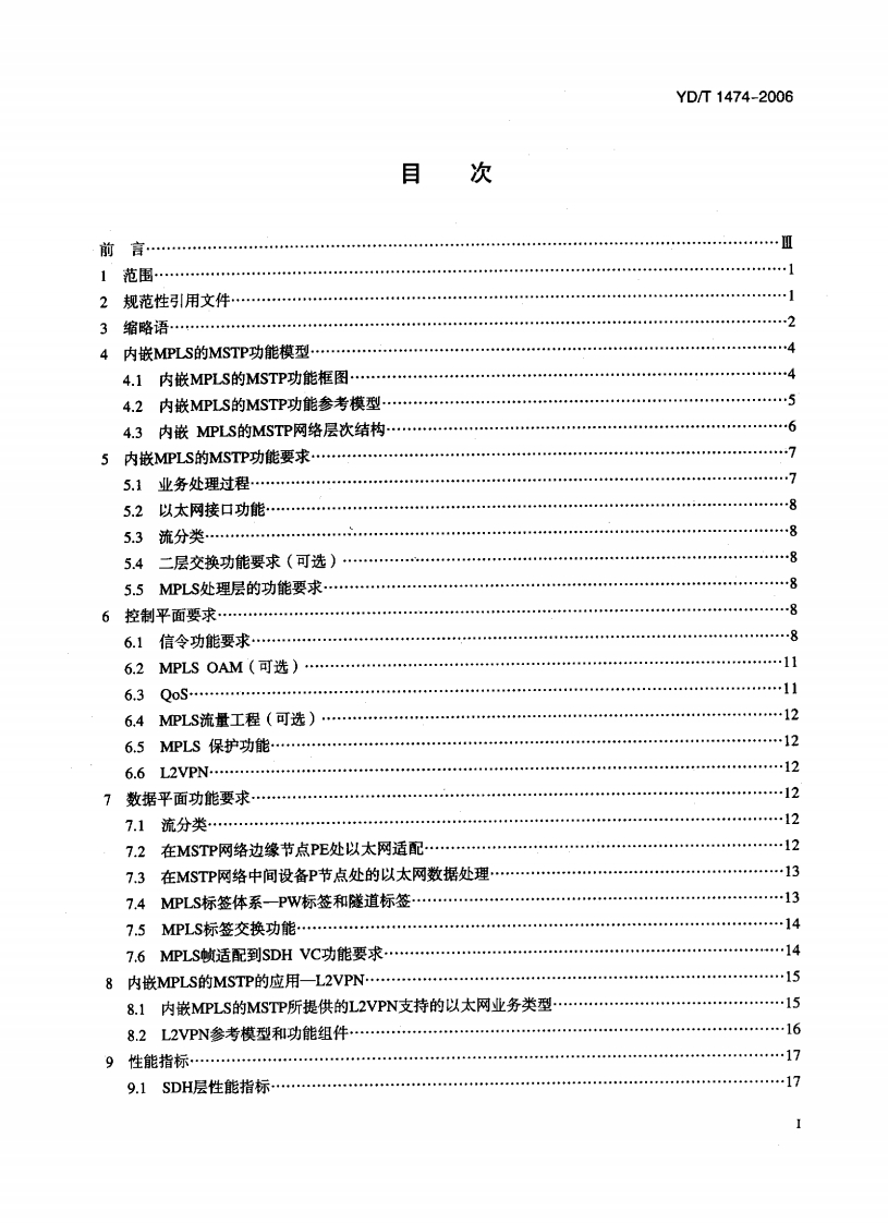 YD中华人民共和国通信行业标准YD/T1474-2006基于SDH的多业务传送节点(MSTP)技术要求一内嵌多协议标记交换(MPLS)功能部分Technical Requirements of Multi-sesviceTransport Platform (MSTP)Based on SDH一一Embedded with MPLS Function2006-06-08发布2006-10-01实施中华人民共和国信息产业部发布