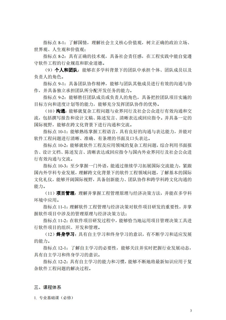 软件工程第二学士学位专业培养方案一、培养目标1.基本培养目标培养的学生身心健康、知识结构合理,有健全的人格、高尚的人文情怀和社会责任感,有一定的批判思维与创新能力、科学研究能力、沟通交流能力、终身学习能力和组织管理能力,具有国际视野和团队合作精神。2.专业培养目标培养的学生系统地掌握软件工程领域的基础理论与专业知识,掌握软件开发方法与主流技术、软件项目过程管理等基本知识与技能,能够将基本原理与技术应用于复杂软件系统分析、设计、实现、验证和维护以及软件系统开发管理能力。使学生毕业后能够从事软件工程相关的科学研究,以及软件系统的分析与设计、系统架构、软件开发、项目管理以及软件系统的运行维护等工作的创新型、复合型高级专业人才。二、毕业要求(1)工程知识:能够将数学、自然科学、工程基础和专业知识用于解决复杂工程问题。指标点1-1:能够将数学、自然科学知识运用到软件工程问题的适当表述之中指标点1-2:掌握信息类工程基础知识,能够系统的理解复杂的软件工程领域问题:指标点1-3:能够将软件工程的专业知识用于模型构建和求解方案的推导与计算:指标点1-4:能够综合运用所学知识对复杂软件工程问题的解决方案进行评价,并编程实现。(2)问题分析:能够应用数学、自然科学和工程科学的基本原理,识别、表达、并通过文献研究分析复杂软件工程问题,以获得有效结论。指标点2-1:能应用基本科学理论和工程知识识别和判断软件工程领域的复杂工程问题:指标点2-2:能够正确表达复杂工程问题的核心环节和参数,并分析这些环节和因素对复杂问题的影响机制:指标点2-3:掌握科技文献、资料的查阅和分类方法,具备借助文献研究对解决方案进行论证和评价的能力。(3)设计开发解决方案:能够设计针对复杂软件工程问题的解决方案,设计满足特定需求的系统、单元(部件)或工艺流程,并能够在设计环节中体现创新意识,考虑社会、健康、安全、法律、文化以及环境等因素。指标点3-1:掌握软件工程概念、原则和方法,具备软件开发能力:指标点3-2:能够在软件设计方案可行性分析中,综合考虑社会、健康、安