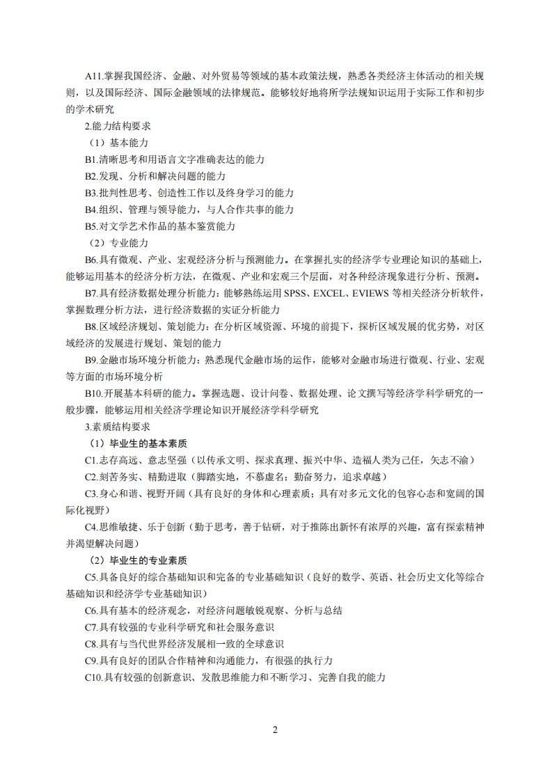经济学专业培养方案专业代码:020101专业名称:经济学一、培养目标1.基本培养目标培养的学生身心健康、知识结构合理,有健全的人格、高尚的人文情怀和社会责任感,有一定的批判思维与创新能力、科学研究能力、沟通交流能力、终身学习能力和组织管理能力,具有国际视野和团队合作精神。2.专业培养目标本专业面向国家经济和社会发展需求,培养具有扎实的经济学基本理论基础,掌握经济运行基本规律,熟练应用现代经济学的主要分析方法、计算机技术手段和实践操作技能,熟悉经济贸易相关政策法规,能在经济学及其相关领域,政府部门和企业从事经济调查、经济预测、分析、规划、策划等方面工作的拔尖创新型人才和复合应用型人才。二、毕业要求1.知识结构要求(1)毕业生应掌握的基本知识A1.历史、哲学、文学、艺术等领域的基本知识(培养学生具有正确的历史观、世界观、人生观、价值观、审美观)A2.社会科学学科研究方法的基本知识(让学生掌握社会科学的基本知识,了解基本研究方法,具有人文情怀和社会责任感)A3.数理与逻辑分析的基础知识(让学生掌握数理与逻辑分析的基本知识)A4.现代信息技术的基本知识(让学生掌握现代网络技术、通信技术和信总处理技术等的基本知识)A5.经济管理、生态环境、生命科学等方面的基本知识(让学生掌握自然环境与社会发展、经济管理与社会科学、科技发展与文明传承、文明对话与国际视野等方面的基本知识)(2)本科生应掌握的专业知识A6.应掌握政治经济学、微观经济学、宏观经济学、产业经济学、发展经济学等相关经济学的基本概念、理论,具有较扎实的经济学理论基础A7.掌握计量经济、统计、数理经济相关数理分析方法,并能将数理分析方法应用于经济现实的分析与预测中A8.掌握区域经济、区域经济规划、投资项目评估、国际金融、货币银行、投资经济等涉及区域经济和金融学两个应用经济领域的专业知识和专业技能A9.熟知经济学说史、中国经济史,阅读相关经济学名著,掌握文献检索、资料查询的基本方法,了解中外经济学学术动态及应用前景:了解中国经济体制改革实践和经济发展过程。A1O.熟练应用计算机应用技术,掌握SPSS、EXCELL、EVIEWS等相关经济分析软件,对社会经济进行调查、分析、预测、规划、策划等实际操作能力1