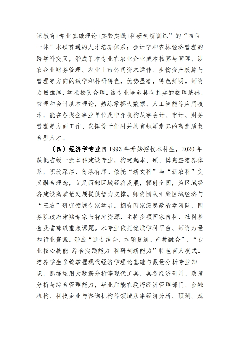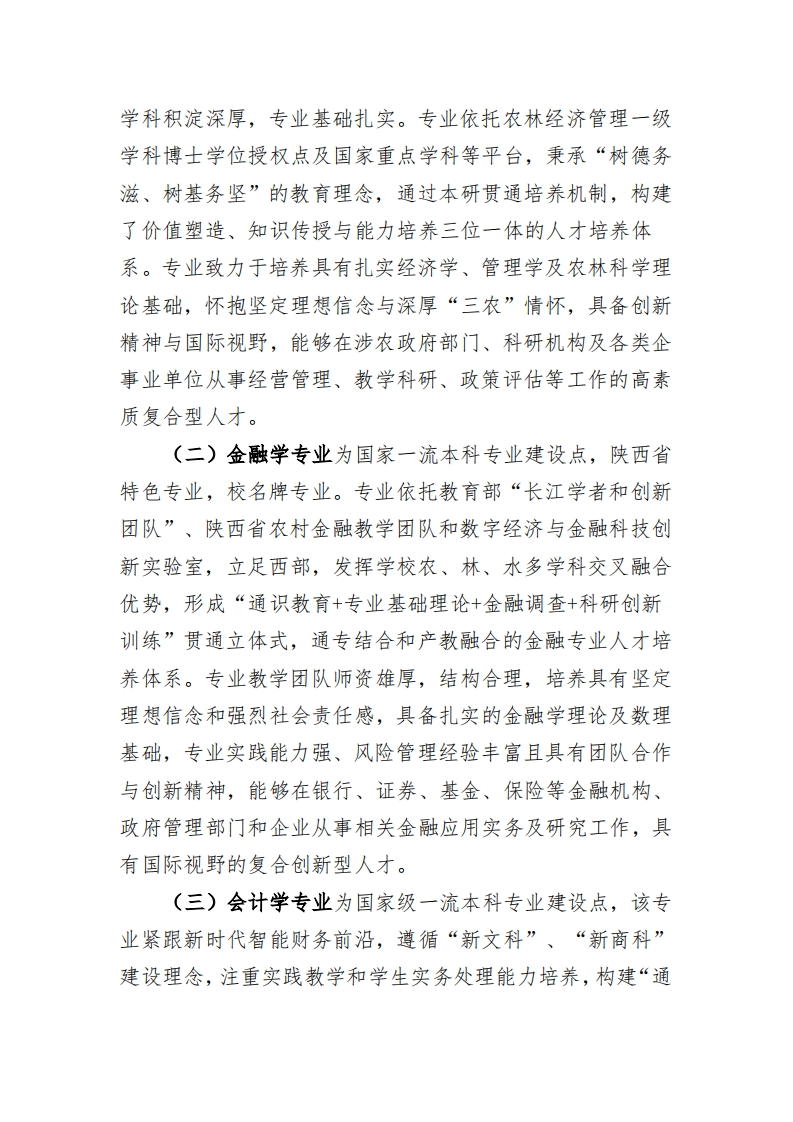 经济管理学院2025-2026学年普通本科生转专业考核办法根据《西北农林科技大学本科生转专业实施办法》(校教发〔2025)256号)等文件要求,结合学院实际,制定了2026年度接收普通本科生转专业条件及考核要求。一、申请条件及要求(一)学生满足下列情况之一的,可申请转专业:1、根据学生兴趣和专长,转专业后更能发挥其专长、助其成长的;2、入学后因患某种疾病或生理缺陷,经校医院或二级甲等及以上医院检查证明,不能在原专业学习,但尚能在其他专业学习的;3、休学创业或退役后复学,因自身需要调整专业的。(二)学生有下列情况之一的,不允许转专业1、国家有相关规定或者录取前与学校有明确约定不得转专业的;2、入学超过3年的(含计入学习年限的休学等时间);3、正在休学、保留入学资格、保留学籍的:4、达到退学条件或应予以退学的;5、其他不适合转专业的。(三)录取前对转专业范围作出约定的,从其约定。二、专业特点及培养要求(一)农林经济管理专业为国家级一流本科专业建设点,其前身可溯至1936年原国立西北农林专科学校农经组,