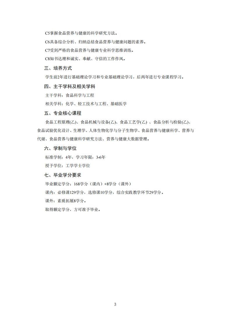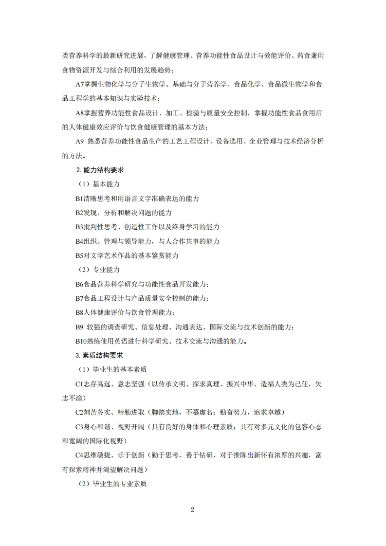 食品营养与健康专业培养方案专业代码:082710T专业名称:食品营养与健康一、培养目标1.基本培养目标本专业培养德、智、体、美、劳全面发展的社会主义建设者和接班人。培养的学生身心健康、知识结构合理,有健全的人格、高尚的人文情怀和高度的社会责任感,有一定的批判思维与创新能力、科学研究能力、沟通交流能力、终身学习能力和组织管理能力,具有国际视野和团队合作精神。2.专业培养目标本专业学生掌握化学、工程学和营养健康科学的基础理论知识和技能,具有食品营养科学研究、健康管理和功能食品生产与开发的技术能力,具有良好的技术沟通和科技创新素质,能在食品加工与流通领域,从事与营养健康相关的科学研究、教育教学、功能食品开发、政策咨询、食品生产及技术管理等方面工作的高级专业人才。二、毕业要求1.知识结构要求(1)毕业生应掌握的基本知识A1历史、哲学、文学、艺术等领域的基本知识(培养学生具有正确的历史观、世界观、人生观、价值观、审美观)。A2社会科学学科研究方法的基本知识(让学生掌握社会科学的基本知识,了解基本研究方法,具有人文情怀和社会责任感)A3数理与逻辑分析以及物理学的基础知识(让学生掌握数理与逻辑分析、大学物理的基本知识)A4现代信息技术的基本知识(让学生掌握现代网络技术、通信技术和信息处理技术等的基本知识)A5生态环境、生命科学、经济管理等方面的基本知识(让学生掌握生态环境与人类命运、科技创新与社会发展、农业发展与政策法规、传统文化与世界文明等方面的基本知识)(2)毕业生应掌握的专业知识A6熟悉国内外食品工业和健康产业发展的方针、政策、法规和动向,了解食品与人1