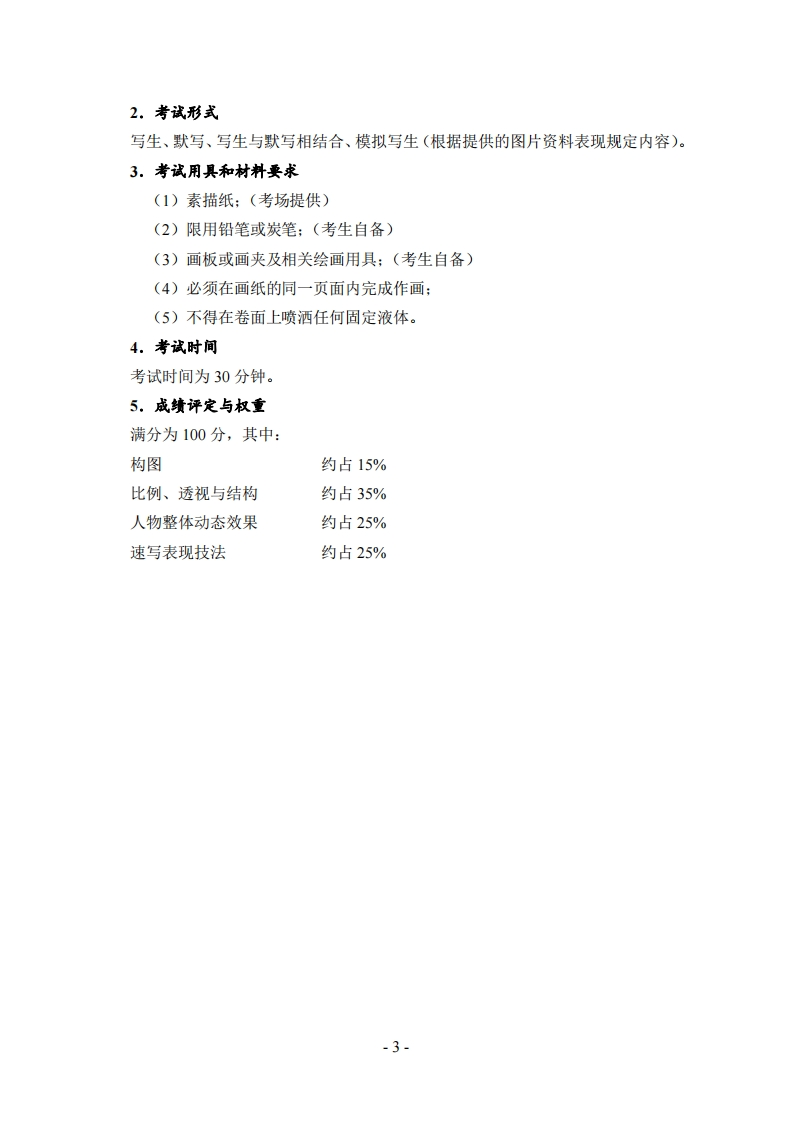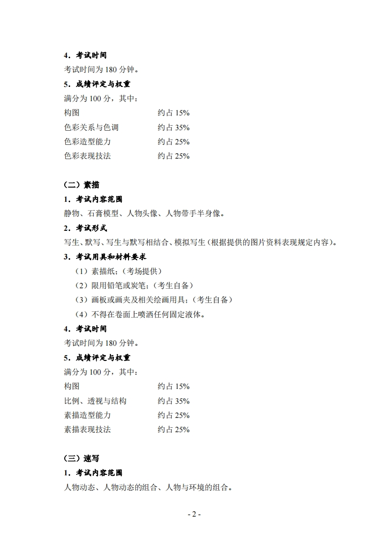 2018年湖北省普通高校艺术专业招生统一考试美术与设计学类考试大纲一、考试性质普通高校艺术专业招生统一考试美术与设计学类考试(以下简称美术统考)是普通高考的重要组成部分。美术统考注重考查美术与设计学类专业基础学科的基础知识和基本技能,主要测试考生的综合艺术素质(包括审美能力、观察能力、感知能力、造型能力、表现能力和技法运用能力等)。高等院校根据考生美术统考成绩和高考文化课成绩,按确定的招生计划,全面衡量、择优录取。因此,美术统考应具有必要的区分度,较高的信度和效度。二、考试科目和考核目的美术统考包括色彩、素描、速写三门基础科目的考试。色彩:考查考生对色彩的感知能力、认识能力、色彩关系和色调的把握能力以及色彩的表现能力。素描:考查考生对描绘对象的整体造型、比例、透视、结构、体积、空间、明暗、层次、质感等方面的观察、认识、理解和表现能力。速写:考查考生在较短的时间内对人物的比例、透视、结构的观察、认识、理解和把握能力,对人物动态、人物动态组合、人物与环境组合的表现能力以及速写技法的运用能力。三、考试内容和形式(一)色彩1.考减内容范国静物、风景。2.考试形式写生、默写、写生与默写相结合、模拟写生(根据提供的图片资料表现规定内容)。3。考试用具和材料要求(1)水粉纸或水彩纸:(考场提供)(2)限用水粉或水彩颜料:(考生自备)(3)画板或画夹及相关绘画用具:(考生自备)(4)不得在卷面上喷洒任何固定液体。