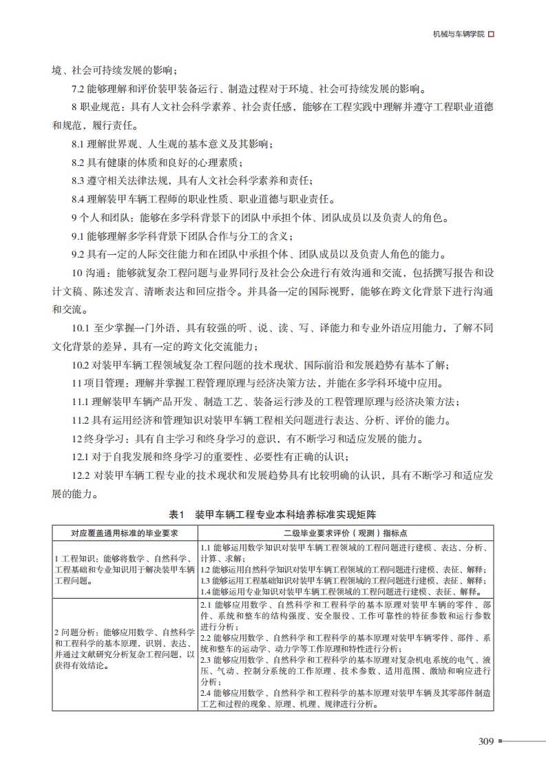 机械与车辆学院口装甲车辆工程专业培养方案一、专业培养日标:以国家安全和国防建设重大需求为导向,结合我国军用车辆及其他相关车辆行业的需求,培养德智体全面发展,具有科学素养、工程素养和人文素养,具备装甲车辆工程、车辆工程和机械工程等领域的专业基础知识、应用能力、创新意识、组织协调能力、工程实践能力,具有国际化视野和竞争力,能够在装甲车辆工程、车辆工程及机械工程等领域从事产品设计、制造、试验、科学研究和管理的国防拔尖创新型领军人才、科学家和工程师。本专业学生毕业后5年左右,预期达到以下目标:(1)具有高尚的职业道德和深厚的人文科学素养:(2)能有效运用工程技术原则提出装甲车辆工程或相关机械工程领域的技术解决方案;(3)能在跨职能团队中工作、交流并胜任领导或重要角色;(4)在与装甲车辆工程或相关专业领域内成功就业或攻读研究生学位;(5)通过继续教育或其他学习渠道不断增加知识和提升能力:(6)具有国际交流、合作能力和能为当地、本国及全球社会服务的能力。二、毕业要求:1工程知识:能够将数学、自然科学、工程基础和专业知识用于解决装甲车辆工程问题。1.1能够运用数学知识对装甲车辆工程领域的工程问题进行建模、表达、分析、计算、求解;12能够运用自然科学知识对装甲车辆工程领域的工程问题进行建模、表征、解释:13能够运用工程基础知识对装甲车辆工程领域的工程问题进行建模、表征、解释:1.4能够运用专业知识对装甲车辆工程领域的工程问题进行建模、表征、解释。2问题分析:能够应用数学、自然科学和工程科学的基本原理,识别、表达、并通过文献研究分析复杂工程问题,以获得有效结论。21能够应用数学、自然科学和工程科学的基本原理对装甲车辆的零件、部件、系统和整车的结构强度、安全服役、工作可靠性的特征参数和运行参数进行分析;22能够应用数学、自然科学和工程科学的基本原理对装甲车辆零件、部件、系统和整车的运动学、动力学等工作原理和特性进行分析:23能够应用数学、自然科学和工程科学的基本原理对复杂机电系统的电气、液压、气动、控制分系统的工作原理、技术参数、适用范围、激励和响应进行分析:307