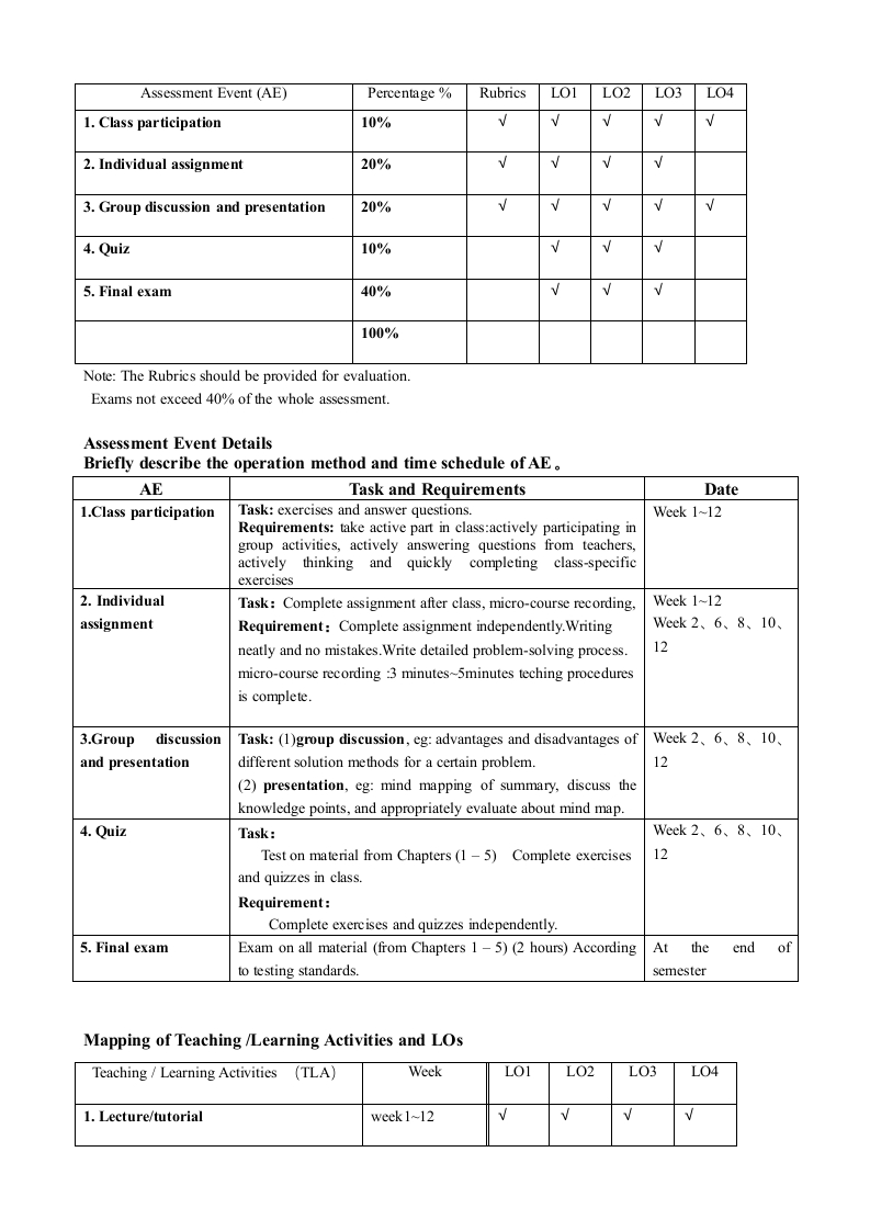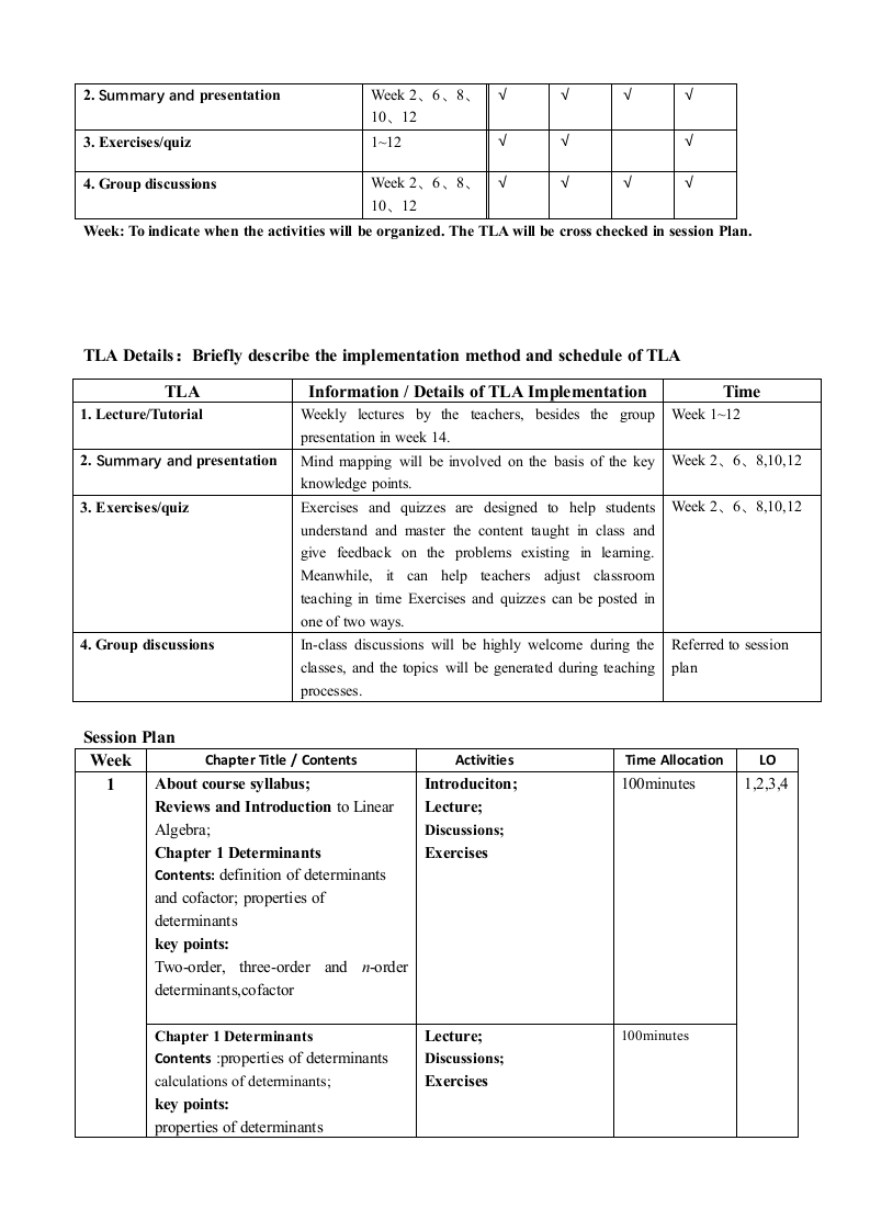 ISEC Course SyllabusCourse Title:Linear AlgebraMajor of The Students:Electronic Information Science and TechnologyCourse Credit:3Total Contact Hours:48Contact information of the instructor:xiejingzheng@163.comPre-Requisite:Elementary mathematics.Course Description:Linear algebra is one of the most important and fundamental subjects in mathematics.Its theories andmethods have been widely used in modern engineering science,social science research and application,andbecome a required course for science and engineering students in colleges and universities.This course provides an introduction to the ideas and methods of linear algebra,which students willlearn by understanding them geometrically,justifying them algebraically,and using them to solve problemsin various disciplines.Furthermore,Students can be proficient in analysing and using matrix operation andmatrix method to solve practical cases.On the other hand,this course can also better cultivate and improvelogical reasoning ability,abstract thinking ability and spatial imagination ability of the students duringlearning and applying processes of Linear Algebra.At last,it is a prerequisite for all advanced courses inmathematics and provides excellent preparation for graduate work in the natural sciences and quantitativesocial sciences.Course Learning Outcomes:LO1 Explore the core definitions,theorems and properties associated with determinants ,systems oflinear equations,manipulation of matrices,linear transformations,orthogonality,andeigenvalues,eigenvectors.LO2:Apply linear algebra to deal with some theoretical problems and to solve some practical problems.LO3:Cultivate and improve students'ability of logical thinking and abstract thinking.LO4:Develop the ability of analyzing and solving problems for the further study of professional coursesand applications.Note:Each LOs should be defined to focus on skills,abilities that can be applied in the practice for theprofessional development and working context.The LOs should NOT be the contents of teaching and learningMapping of Assessment Event and LOs(Tick the LOs that can be evaluated by the particular assessment events)