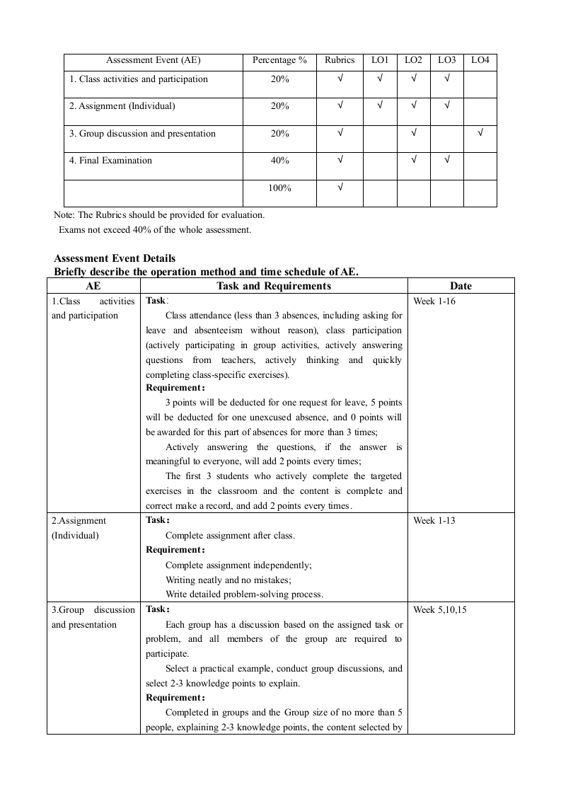 ISEC Course SyllabusCourse Title:Digital Signal ProcessingCourse Code:181010040Major of The Students:Electronic Information Science and TechnologyCourse Credit:3Total Contact Hours:48 (16 weeks)Instructor:Wang YingContact information of the instructor:370949557@qq.comPre-Requisite:NoneCourse Description:Digital signal processing mainly studies using sequences of numbers or symbols to represent signalwaveforms,and processing these sequences in a digital way.Through the study of this course,studentswill be able to master the methods of frequency spectrum analysis of signals using DFT and FFTtransforms,and be able to design IIR and FIR digital filters based on technical specifications,laying atheoretical foundation for students to further study communication and information courses.Course Learning Outcomes1.L01:By analyzing the key tasks of national construction,we aim to help students establish socialistcore values and a sense of social responsibility,and inspire their scientific and technological patriotismand mission responsibility.2.L02:Describe the basic concepts,principles and analytical methods of digital signals and systems.3.L03:Establish the system model,distinguish different system analysis methods,and select a suitablemethod to solve the problem.4.L04:Cultivate the literacy of digital signal processing algorithm development and hardwareimplementation to solve practical problems.Note:Each LOs should be defined to focus on skills,abilities that can be applied in the practice for theprofessional development and working context.The LOs should NOT be the contents of teaching and leamingMapping of Assessment Event and LOs