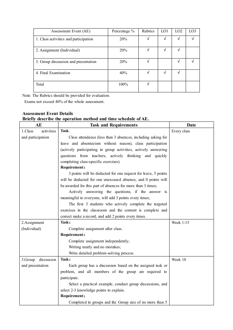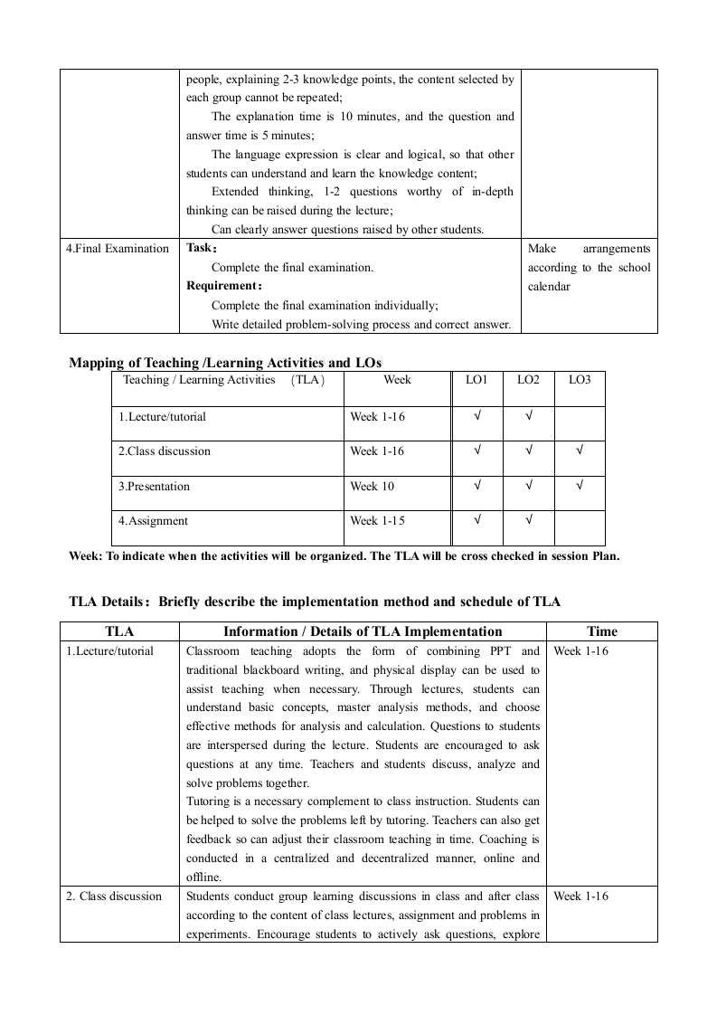 ISEC Course SyllabusCourse Title:Signals and systemsCourse Code:181000230Major of The Students:Electronic Information Science and TechnologyCourse Credit:3Total Contact Hours:48 (16 weeks)Instructor:Chen ShuangContact information of the instructor:157200223@qq.comPre-Requisite:NoneOffered semester:The Fourth SemesterLaunch Date:2024.03Course Description:This course is an important basic course required for electronic information science and technologymajors.It mainly discusses the basic analysis methods for determining the characteristics of signals,the characteristics of linear time-invariant systems,and the passage of signals through linear systems.Through the study of this course,students can master the basic theory and basic analysis method ofsignal analysis and linear system,further cultivate students'thinking reasoning ability and analyticaloperation ability,and lay the necessary foundation for the study of subsequent courses.Course Learning Outcomes1.L01:Describe the basic concepts,principles and analytical methods of signals and systems.2.L02:Establish the system model,distinguish different system analysis methods,and select a suitablemethod to solve the problem.3.L03:Use signal and system theory to solve practical problems and play as a member of teamcoordinating with others complete tasks.Note:Each LOs should be defined to focus on skills,abilities that can be applied in the practice for theprofessional development and working context.The LOs should NOT be the contents of teaching and leamingMapping of Assessment Event and LOs