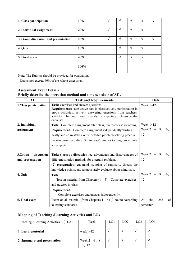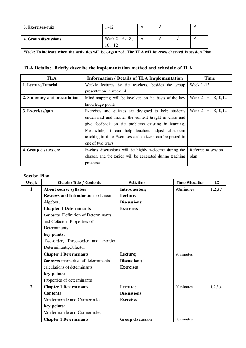 ISEC Course SyllabusCourse Title:Linear AlgebraMajor of The Students:Electronic Information Science and TechnologyCourse Credit:3Total Contact Hours:48Contact information of the instructor:xiejingzheng@163.comPre-Requisite:Elementary mathematics.Course Description:Linear algebra is one of the most important and fundamental subjects in mathematics.Its theories andmethods have been widely used in modern engineering science,social science research and application,andbecome a required course for science and engineering students in colleges and universities.This course provides an introduction to the ideas and methods of linear algebra,which students willlearn by understanding them geometrically,justifying them algebraically,and using them to solve problemsin various disciplines.Furthermore,Students can be proficient in analysing and using matrix operation andmatrix method to solve practical cases.On the other hand,this course can also better cultivate and improvelogical reasoning ability,abstract thinking ability and spatial imagination ability of the students duringlearning and applying processes of Linear Algebra.At last,it is a prerequisite for all advanced courses inmathematics and provides excellent preparation for graduate work in the natural sciences and quantitativesocial sciences.Course Learning OutcomesLO1:Explore the core definitions,theorems and properties associated with Determinants,Systems oflinear equations,Matrices,Vector Space,Eigenvalues and Eigenvectors of Matrices,and Quadratic Forms.LO2:Apply linear algebra to deal with some theoretical problems and to solve some practical problems.LO3:Cultivate and improve students'ability of logical thinking and abstract thinking.LO4:Develop the ability of analyzing and solving problems for the further study of professional coursesand applications.Note:Each LOs should be defined to focus on skills,abilities that can be applied in the practice for theprofessional development and working context.The LOs should NOT be the contents of teaching and learningMapping of Assessment Event and LOs(Tick the LOs that can be evaluated by the particular assessment events)Assessment Event (AE)PercentageRubricsL01L02L03L04