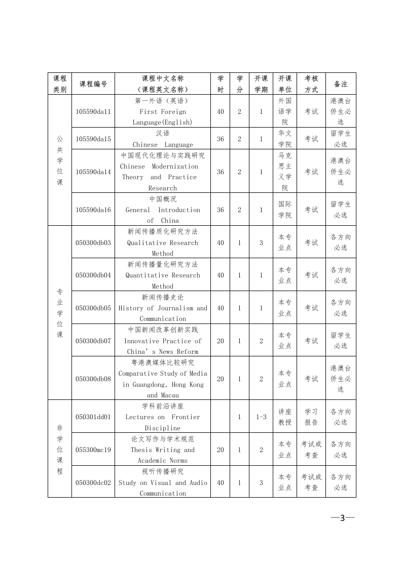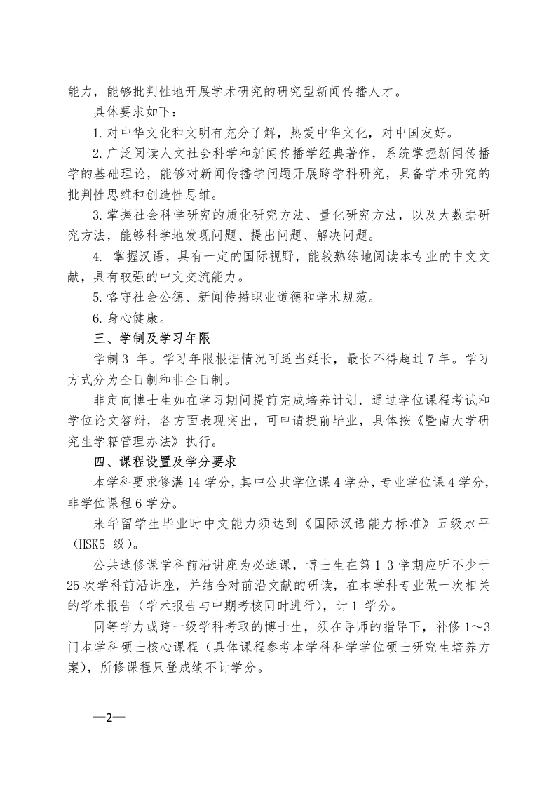 新闻传播学一级学科博士研究生培养方案(外招)Developing Plan for PhD of Journalism and Communication(0503)一、学科专业1.050301新闻学Journalism2.050302传播学Communication3.0503Z1广告学Advertising4.0503Z2广播电视学Broadcasting二、培养目标(一)港澳台生培养具有较高综合素质,爱国爱港爱澳,自觉拥护祖国统一,系统掌握新闻传播学基础理论、研究方法、前沿议题,具备较高的跨学科视野和国际对话能力,能够批判性地开展学术研究的研究型新闻传播人才。具体要求如下:1.正确认知中华传统文化,具有爱国意识。2.广泛阅读人文社会科学和新闻传播学经典著作,系统掌握新闻传播学的基础理论,能够对新闻传播学问题开展跨学科研究,具备学术研究的批判性思维和创造性思维。3.掌握社会科学研究的质化研究方法、量化研究方法,以及大数据研究方法,能够科学地发现问题、提出问题、解决问题。4.熟练掌握一门外语,具有阅读外文文献、开展国际对话的外语交流能力。5.恪守社会公德、新闻传播职业道德和学术规范。6.身心健康。(二)华侨华人及外国留学生培养具有较高综合素质,了解中国制度、文化特点,系统掌握新闻传播学基础理论、研究方法、前沿议题,具备较高的跨学科视野和国际对话1