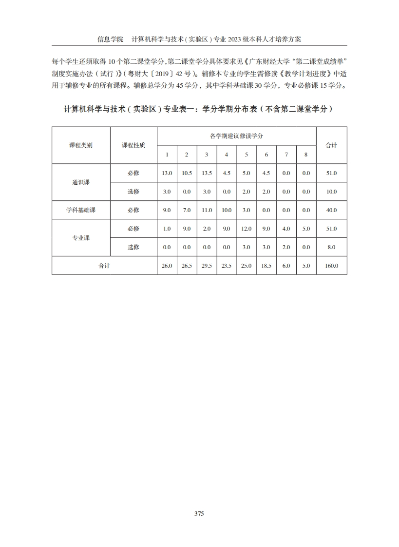 信息学院计算机科学与技术(实验区)专业2023级本科人才培养方案信息学院计算机科学与技术(实验区)专业2023级本科人才培养方案一、培养目标本实验区培养适应国家和粤港澳大湾区经济发展需求,德、智、体、美、劳全面发展,系统掌握计算机科学基本理论知识、技能、方法,具有一定的数理及经管基础,熟悉人工智能的基本理论和应用技术,具有从事金融软件开发、经济计算及商务智能应用等工作的能力,能将金融、商务及经济知识与信息处理技术有机结合应用于工程与管理实践,具有跨学科交叉能力和创新创业能力,能够胜任政府机关、企事业单位、科研院所尤其是金融机构和金融科技企业中的计算机系统分析、设计、开发及研究等相关工作的“计算机+”复合型卓越人才。二、培养要求:1.知识要求:(1)了解与本专业相关的职业和行业的重要法律法规及方针政策,理解工程技术与信息技术应用相关的伦理的基本要求;(②)掌握从事本专业工作所需的数学和其他相关的自然科学知识以及一定的人文社会科学基础(经管法等)知识;③)系统掌握计算机科学与技术学科的基础理论和专业知识,理解本学科的基本概念、知识结构和典型方法,了解本专业学科的前沿和发展趋势。2.能力要求:(1)具有计算思维能力,能运用计算机科学技术求解问题,具备专业实践能力,可以完成软件系统开发、算法应用以及行业领域应用等实际工作;(②)具有较强的创新能力和信息获取能力,能将人工智能技术与经济知识、管理知识及金融等有机结合应用于工程与管理实践;(③)具有一定的组织管理能力、表达能力、独立工作能力、人际交往能力和团队合作能力,具有一定的外语应用能力,具有一定的国际视野和跨文化交流、竞争与合作能力3.素质要求:()具有良好的思想品德和较高的道德情操,热爱社会主义祖国,拥护中国共产党的领导,掌握马列主义、毛泽东思想与中国特色社会主义基本理论:(②)具有良好的人文社会科学素养、职业道德和心理素质,社会责任感强;(③)能独立思考,坚持理论联系实际、实事求是和谦虚谨慎、认真细致的科学态度,自觉自愿地遵守职业道德规范。三、所属专业类计算机类四、专业核心课程计算机科学导论、面向对象程序设计(双语)、数据结构、计算机组成原理、操作系统、管理运筹学、数据库原理、计算机网络、编译原理、算法设计与分析、人工智能基础、机器学习、软件工程。五、标准修业年限四年六、授予学位工学学士七、修读要求主修本专业的学生应修满160学分(不含第二课堂学分),其中通识必修课51学分、通识选修课10学分,学科基础课40学分,专业必修课51学分、专业选修课8学分:同时,除港澳台学生外,374