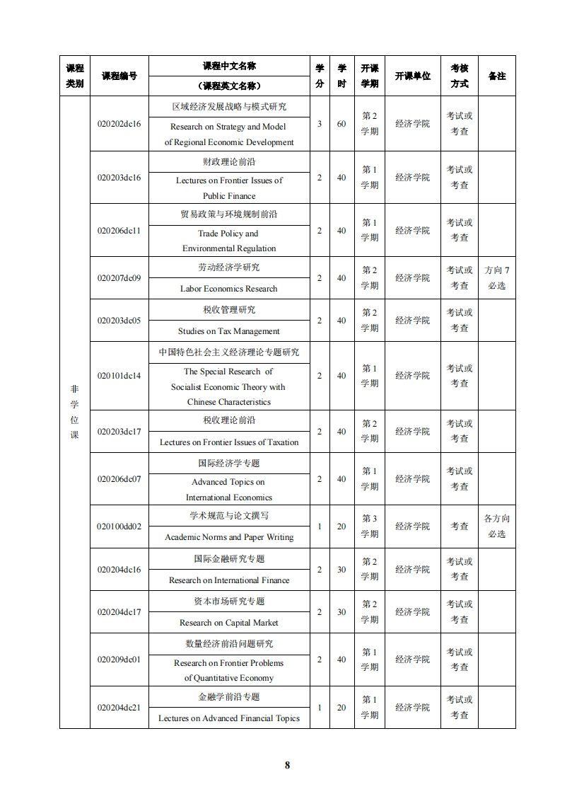应用经济学博士研究生培养方案(代码:0202)一、学科方向1.02020l国民经济学National Economics2.020202区域经济学Regional Economics3.020203财政学Public Finance4.020204金融学Finace5.020205产业经济学Industrial Economics6.020206国际贸易学International Trade7.020207劳动经济学Labor Economics8.020209数量经济学Quantitative Economics9.020220公司金融与投资学Corporate Finance and Investment二、学科简介及培养目标(一)博士生应成为在本学科上掌握坚实宽广的基础理论和系统深入的专门知识,严谨缜密的逻辑思维能力,在掌握高等数学、概率与数理统计等方法的基础上,着重学习高等经济学理论知识和方法体系,具备把经济理论知识、科学的经验研究方法与实践结合的能力,有效解释经济现象及其规律。至少熟练掌握1门外国语,能熟练阅读本学科的外文文献,具有较强的写作能力和独立从事国际学术交流的能力:具有较强的学术素养、科学精神,诚信可靠,并且具有强烈的科学责任感:本学科博士毕业生具有独立从事研究和教学工作的能力,适合在高等院校、科研机构、经济决策和经济管理部门、金融机构、大型企业等从事高层次的教学、研究和实际经济管理工作。(二)在港、澳、台地区招收的博士生,应热爱祖国和中华文化,遵纪守法,品行端正,自觉拥护祖国统一、拥护“一国两制”、为港澳长期繁荣稳定和实现祖国和平统一做贡献的坚定爱国者,愿意为祖国和居住地的社会发展作出贡献:在海外招收的华人和其他外国籍博士生,应热爱中华文化,对中国友好,主动担当中外交流的文化使者,遵纪守法,品行端正,愿为社会发展作出贡献。(三)身心健康。三、学制和学习年限博士生的学制为3年,非全日制学习年限不少于4年。博士生的学习年限,根据情况可适当延长,最长不得超过7年。四、课程设置及学分要求本学科要求修满20学分。其中,公共学位课4学分,专业学位课6学分,非学位课10学分。6