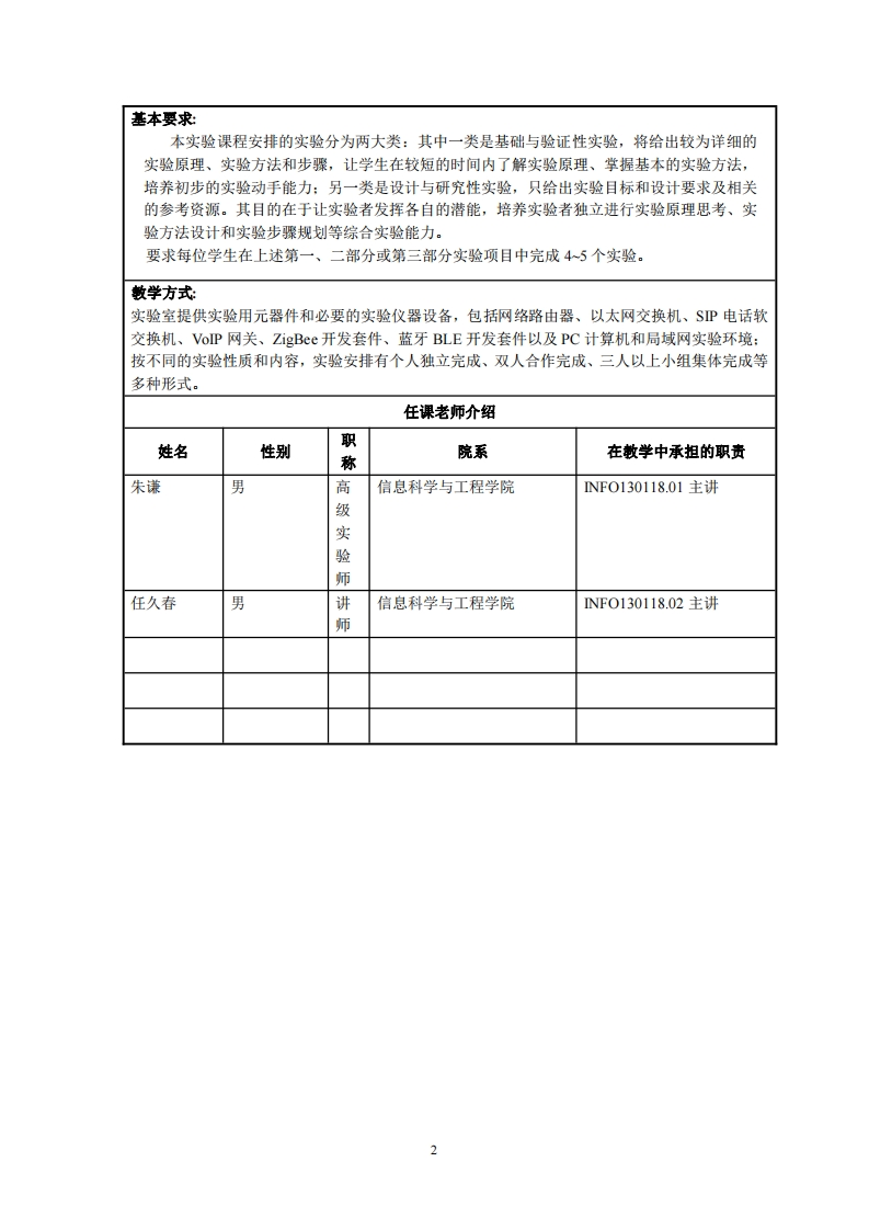复旦大学课程教学大纲课程代码NF0130118编写时间2016.4课程名称《通信系统实验(下)》英文名称Advanced Experiments of Communication System学分数3周学时3开课院系信息科学与工程学院任课老师朱谦、任久春预修课程《计算机数据通信与网络》、《通信系统实验(上)》、《微机原理与接口技术》课程性质通信工程专业必修课本课程属通信科学与工程系本科生的专业基础实验,主要教学目的是使学生在可选择的完成“网络路由与系统服务”、“无线通信及其应用系统”、P多媒体和ICT教学目的融合通信系统”等方面的综合性实验过程中,运用现代通信原理、计算机数据通信与网络、计算机程序设计等相关理论和基础知识,加强系统概念。培养学生发现问题、提出问题和解决实际问题的能力。根据预修课程的相关教学内容,结合现代通信技术和计算机网络技术应用与发展的趋势,设立以下相应的实验项目:第一部分:网络互连与路由实验,包括“路由器应用与配置、网络路由协基本内容简议、防火墙系统设计与配置、Intranet网络服务系统实验”等内容。介第二部分:无线个人局域网(WPAN)及其应用系统实验,包括ZigBee组网与应用开发、BLE(蓝牙4.0)与Android应用开发等实验内容。第三部分:oIP和ICT融合通信系统实验,包括SIP协议与oIP通信、NGN软交换、ICT融合通信设计与编程”等实验内容。教材和教学参考资料作者书名出版社出版日期《数据通信和网络实验(讲(自编讲义)2016年5月(拟修订)敦材和义)》教学参考资料