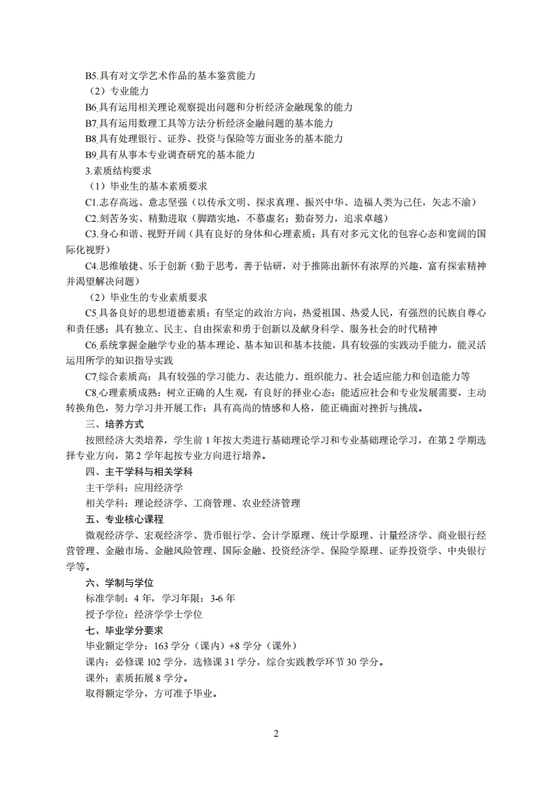 金融学专业培养方案专业代码:020301K专业名称:金融学一、培养目标1.基本培养目标培养的学生身心健康、知识结构合理,有健全的人格、高尚的人文情怀和社会责任感,有一定的批判思维与创新能力、科学研究能力、沟通交流能力、终身学习能力和组织管理能力,具有国际视野和团队合作精神。2.专业培养目标本专业面向国家经济和社会发展需求,培养具有扎实的金融基本理论基础,掌握从事金融工作的研究方法和实践操作技能,熟悉金融领域相关政策法规,能在银行、证券、基金、保险等金融机构、经济管理部门和企业从事金融研究、实务工作的拔尖创新型人才和复合应用型人才。二、毕业要求1.知识结构要求(1)毕业生应掌握的基本知识A1.历史、哲学、文学、艺术等领域的基本知识(培养学生具有正确的历史观、世界观、人生观、价值观、审美观)A2.社会科学学科研究方法的基本知识(让学生掌握社会科学的基本知识,了解基本研究方法,具有人文情怀和社会责任感)A3.数理与逻辑分析的基础知识(让学生掌握数理与逻辑分析的基本知识)A4.现代信息技术的基本知识(让学生掌握现代网络技术、通信技术和信总处理技术等的基本知识)A5.经济管理、生态环境、生命科学等方面的基本知识(让学生掌握生态环境与人类命运、科技创新与社会发展、农业发展与政策法规、传统文化与世界文明等方面的基本知识)(2)毕业生应掌握的专业知识A6系统掌握马克思主义经济学原理、现代西方经济学和现代金融理论,了解本学科的理论前沿和发展动态A7,熟练掌握中国金融业政策和法规及国际上惯例与规则,了解中国金融发展与改革历程与现状:A8熟悉金融业的运作机制及发展规律A9熟练运用相关金融模型与定量分析工具,掌握从事金融学科学研究的基本方法:A10.掌握了解金融学的发展动态、经济学科及金融行业中相关技术的应用前景2.能力结构要求(1)基本能力B1.具有清晰思考和用语言文字准确表达的能力B2.具有发现、分析和解决问题的能力B3.具有批判性思考、创造性工作以及终身学习的能力B4.具有组织、管理与领导能力,与人合作共事的能力1