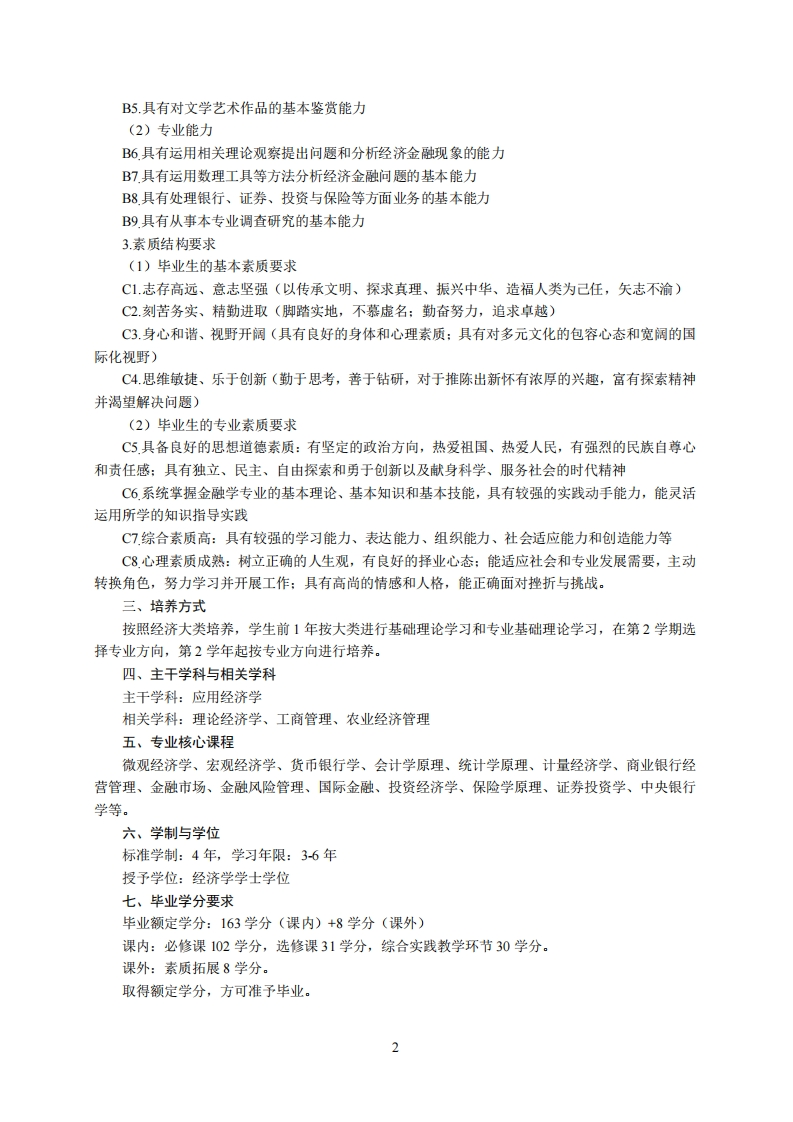 金融学专业培养方案专业代码:020301K专业名称:金融学一、培养目标1.基本培养目标培养的学生身心健康、知识结构合理,有健全的人格、高尚的人文情怀和社会责任感,有一定的批判思维与创新能力、科学研究能力、沟通交流能力、终身学习能力和组织管理能力,具有国际视野和团队合作精神。2.专业培养目标本专业面向国家经济和社会发展需求,培养具有扎实的金融基本理论基础,掌握从事金融工作的研究方法和实践操作技能,熟悉金融领域相关政策法规,能在银行、证券、基金、保险等金融机构、经济管理部门和企业从事金融研究、实务工作的拔尖创新型人才和复合应用型人才。二、毕业要求1.知识结构要求(1)毕业生应掌握的基本知识A1.历史、哲学、文学、艺术等领域的基本知识(培养学生具有正确的历史观、世界观、人生观、价值观、审美观)A2.社会科学学科研究方法的基本知识(让学生掌握社会科学的基本知识,了解基本研究方法,具有人文情怀和社会责任感)A3.数理与逻辑分析的基础知识(让学生掌握数理与逻辑分析的基本知识)A4.现代信息技术的基本知识(让学生掌握现代网络技术、通信技术和信总处理技术等的基本知识)A5.经济管理、生态环境、生命科学等方面的基本知识(让学生掌握生态环境与人类命运、科技创新与社会发展、农业发展与政策法规、传统文化与世界文明等方面的基本知识)(2)毕业生应掌握的专业知识A6系统掌握马克思主义经济学原理、现代西方经济学和现代金融理论,了解本学科的理论前沿和发展动态A7,熟练掌握中国金融业政策和法规及国际上惯例与规则,了解中国金融发展与改革历程与现状:A8熟悉金融业的运作机制及发展规律A9熟练运用相关金融模型与定量分析工具,掌握从事金融学科学研究的基本方法:A10.掌握了解金融学的发展动态、经济学科及金融行业中相关技术的应用前景2.能力结构要求(1)基本能力B1.具有清晰思考和用语言文字准确表达的能力B2.具有发现、分析和解决问题的能力B3.具有批判性思考、创造性工作以及终身学习的能力B4.具有组织、管理与领导能力,与人合作共事的能力1
