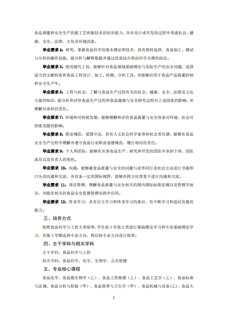 食品质量与安全专业培养方案专业代码:082702专业名称:食品质量与安全一、培养目标本专业培养具备化学、生物学、管理学、营养与卫生学的基础理论知识,掌握扎实的现代食品质量与安全方面的基础理论和知识体系,了解本专业的前沿发展现状和趋势,具有食品科学研究与技术管理能力,具有良好技术沟通和科技创新素质,熟悉国内外食品法规和标准,能在食品加工与流通领域从事科学研究、技术开发、食品生产质量管理和安全控制、教育教学等工作的德智体美劳全面发展的高级专业人才。本专业培养目标具体分解为以下五个:培养目标1:培养的学生德智体美劳全面发展,具备合理知识结构,有健全的人格、高尚的人文情怀和强烈社会责任感,具有一定的批判思维与科学创新能力、语言文字表达能力、终身学习能力和组织管理能力。培养目标2:具备食品科学、分析化学、微生物学、营养与食品卫生学、公共管理学的基础理论知识,掌握食品质量与安全基础理论和知识体系,熟悉国内外食品标准和法规,具备食品质量与安全问题的研究能力。培养目标3:具备在食品加工与流通领域从事产品研发、食品质量安全控制、食品质量评价和检测、食品生产及技术管理等方面的工作能力,成为企业的技术核心人才。培养目标4:具有扎实的专业知识,能够与时俱进,并通过不断学习来拓展自己的知识和能力,能洞察食品生产链条中出现的质量安全问题,具备食品安全生产和营销相关的管理学与经济学知识,能胜任食品质量安全监管部门的工作,成为食品行业的管理者。培养目标5:具有国际视野和团队合作精神,能够在跨文化背景下进行沟通和交流,能够在不同职能团队中发挥特定的作用并具备承担领导角色的能力。二、毕业要求毕业要求1:工程知识:能够将数学、自然科学知识以及相关的工程基础理论和专业知识用于解决食品领域复杂工程问题与和质量安全问题。毕业要求2:问题分析:能够应用数学、自然科学和食品工程的基本原理,通过文献研究,发现、分析并表达食品质量与安全领域实际问题,以获得有效结论。毕业要求3:设计/开发解决方案:能够针对食品原料的特性,以及针对食品生产的加工方法、工艺流程和加工装备选择适合产品质量和安全生产的方法与技术,具备开发提高1