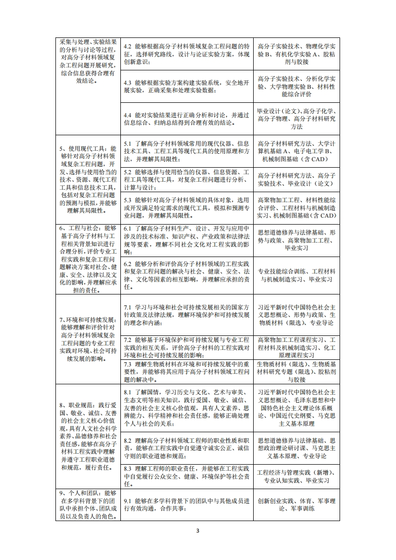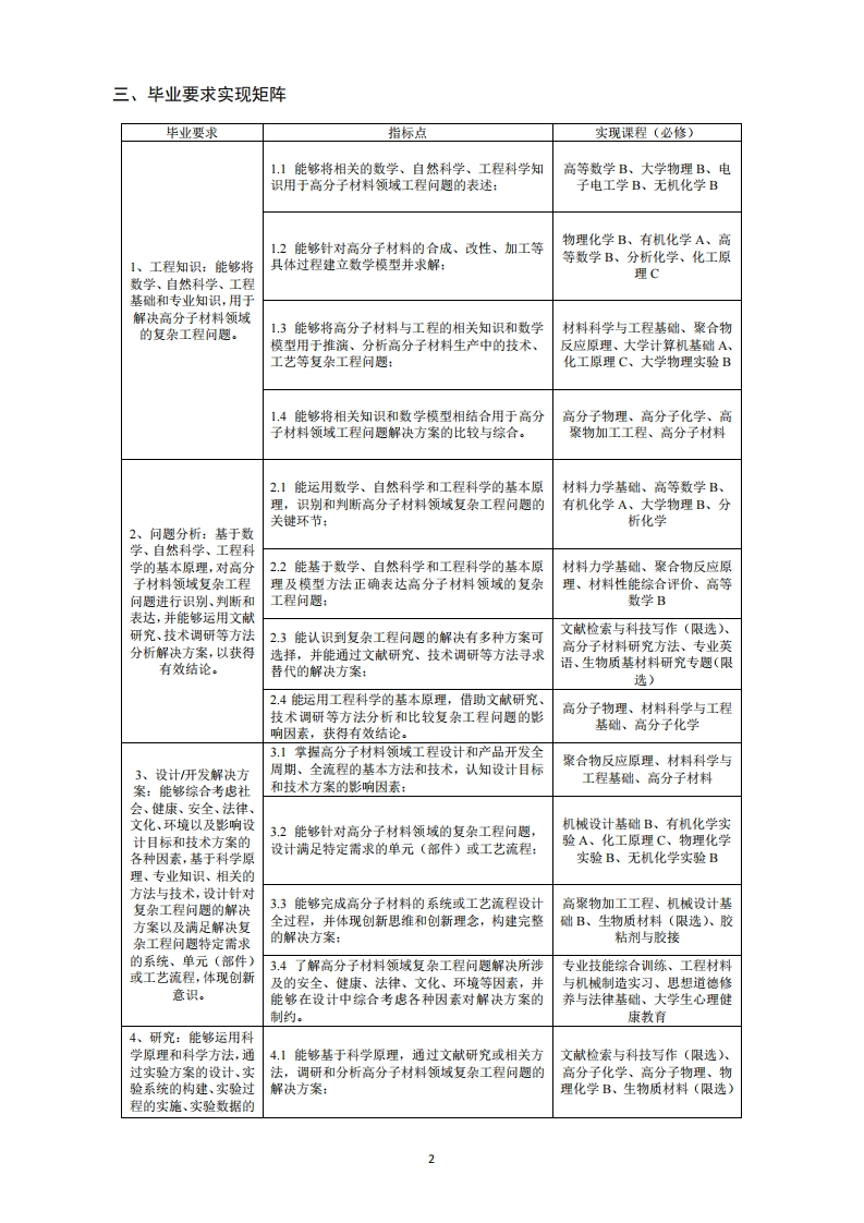 高分子材料与工程专业人才培养方案(专业代码:080407)一、培养目标本专业培养能够践行社会主义核心价值观,具有爱国主义精神、社会责任感、良好的职业道德和人文素养,具有宽广的自然科学知识、扎实的专业基础理论和专业技能,具备良好的分析、表达和解决工程问题的能力,较强的创新能力、团队合作能力、沟通交流能力和自学能力,能运用高分子材料的制备、加工、生产、应用、经营管理等专业知识和相关技术,在高分子材料及其相关领域从事科学研究、生产运行、技术开发、工程设计、技术管理等工作的高水平创新人才。毕业生在木材胶粘剂、生物质材料等林业生物质高分子材料的从业领域具有明显竞争优势。本专业学生毕业后5年左右在社会与专业领域的预期成就为:1.专业技能:具有工程数理知识和高分子材料与工程专业知识,具备创新能力,能够综合运用现代工具及多学科知识对高分子材料(特别是林业生物质高分子材料)领域复杂工程问题进行有效分析并提出系统性解决方案:2.职业定位:能够跟踪高分子材料及相关领域的前沿技术,承担高分子材料与工程(特别是林业生物质高分子材料)领域的科学研究与技术研发、产品开发与工程设计、生产运行与技术管理、市场营销与商务贸易等工作,达到工程师执业水平:3.基本素质:能够践行社会主义核心价值观,身心健康,具有爱国主义精神和社会责任感、良好的人文社会科学素养和工程职业道德,熟悉相关的法律法规及行业规范,注重可持续发展,在工程实践中能坚持公众利益优先。4.社会能力:具备良好的人际交往能力,有效的沟通表达能力、组织管理及执行能力,富有团队合作精神,能够有效带动工程实践项目的组织实施。5.自我发展:具有全球化意识和开阔的国际化视野,拥有自我发展和终身学习的能力,能够主动适应国内外职业环境的变化,不断掌握新兴技术,应对科技发展挑战。二、毕业要求本专业毕业生应具有以下12方面的知识和能力:1.工程知识:能够将数学、自然科学、工程基础和专业知识,用于解决高分子材料领域的复杂工程问题。2.问题分析:基于数学、自然科学、工程科学的基本原理,对高分子材料领域复杂工程问题进行识别、判断和表达,并能够运用文献研究、技术调研等方法分析解决方案,以获得有效结论。3.设计开发解决方案:能够综合考虑社会、健康、安全、法律、文化、环境以及影响设计目标和技术方案的各种因素,基于科学原理、专业知识、相关的方法与技术,设计针对复杂工程问题的解决方案以及满足解决复杂工程问题特定需求的系统、单元(部件)或工艺流程,体现创新意识。4.研究:能够运用科学原理和科学方法,通过实验方案的设计、实验系统的构建、实验过程的实施、实验数据的采集与处理、实验结果的分析与讨论等过程,对高分子材料领域复杂工程问题开展研究,综合信息获得合理有效结论。5.使用现代工具:能够针对高分子材料领域复杂工程问题,开发、选择与使用恰当的技术、资源、现代工程工具和信息技术工具,包括对复杂工程问题的预测与模拟,并能够理解其局限性。6.工程与社会:能够基于高分子材料与工程相关背景知识进行合理分析,评价专业工程实践和复杂工程问题解决方案对社会、健康、安全、法律以及文化的影响,并理解应承担的责任。7.环境和可持续发展:能够理解和评价针对高分子材料领域复杂工程问题的专业工程实践对环境、社会可持续发展的影响。8.职业规范:践行爱国、敬业、诚信、友善的社会主义核心价值观,具有人文社会科学素养、品德修养和社会责任感,能够在高分子材料工程实践中理解并遵守工程职业道德和规范,履行责任。9.个人和团队:能够在多学科背景下的团队中承担个体、团队成员以及负责人的角色。10.沟通:能够就高分子材料领域复杂工程问题与业界同行及社会公众进行有效沟通和交流,包括撰写报告和设计文稿、陈述发言、清晰表达或回应指令,并具备一定的国际视野,能够在跨文化背景下进行沟通和交流。11.项目管理:理解并掌握工程管理原理与经济决策方法,并能在多学科环境中应用。12.终身学习:具有自主学习和终身学习的意识,有不断学习和适应发展的能力,追求创新。1