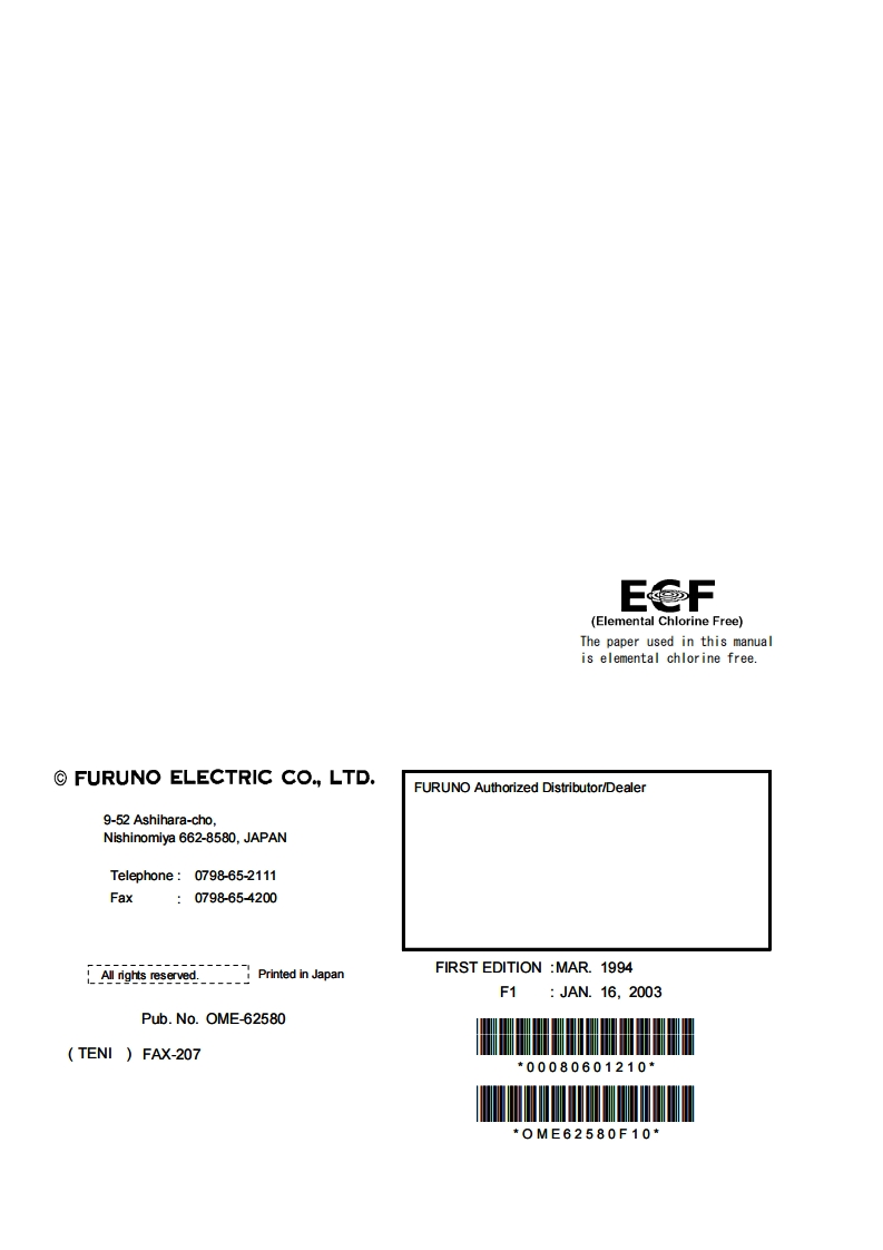 BackFURUNODPERATOR'S MANUALDFAXDUAL FUNCTION FACSIMILE RECEIVERMODELFAX-207This manual contains only operating information.For other information,please refer to the followingmanuals:·Installation…Installation Manual.Servicing.........Service Manual(Extra cost)FURUNO ELECTRIC CO.,LTD.NISHINOMIYA,JAPANP TED IM JAPA