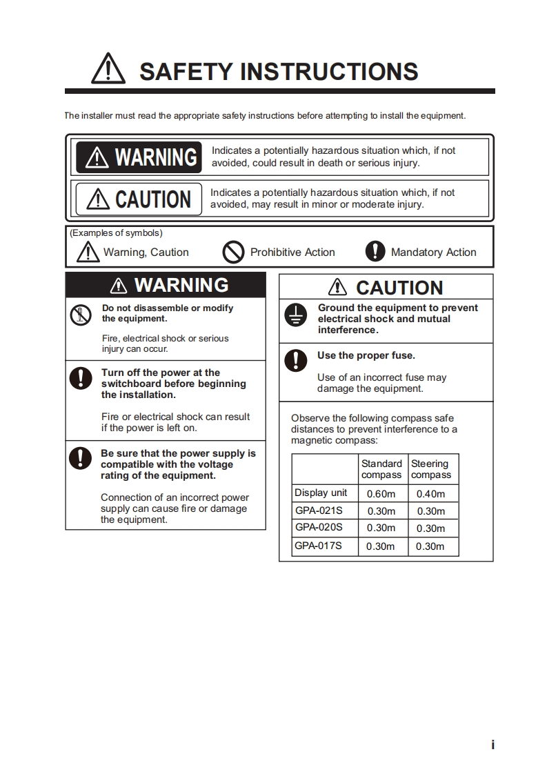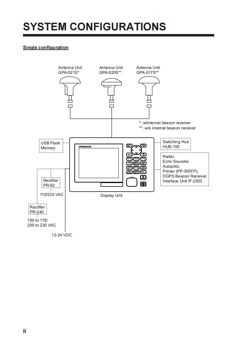 Installation ManualGPS NAVIGATORModel GP-170SAFETY INSTRUCTIONS......SYSTEM CONFIGURATIONS.......................EQUIPMENT LISTS................1.MOUNTING..........1-11.1 Display Unit...............1-11.2 Antenna Unit.....1-32.WIRING.2-12.1Grounding.….2-12.2 External Equipment..............2-22.3MAIN Board............2-23.ADJUSTMENTS...........3-13.1 Checking Operation...3-13.2BeaC0 n Setup..........a...3-33.3 DGPS Operation Checking..........3-73.4Ethernet Setup.…3-83.5 Input/Output Signal..3-103.6Sound Test.......3-193.7 How to Set Dual Configuration...3-193.8Howto Set Route Start Position3-20APPENDIX 1 DIGITAL INTERFACE (IEC 61162-1 EDITION 5(2016))..................AP-1PACKING LISTS ........A-1OUTLINE DRAMINGS................D-1INTERCONNECTION DIAGRAMS....S-1FURUNO ELECTRIC CO.,LTD.www.furuno.comAll brand and product names are trademarks,registered trademarks or service marks of their respective holders.