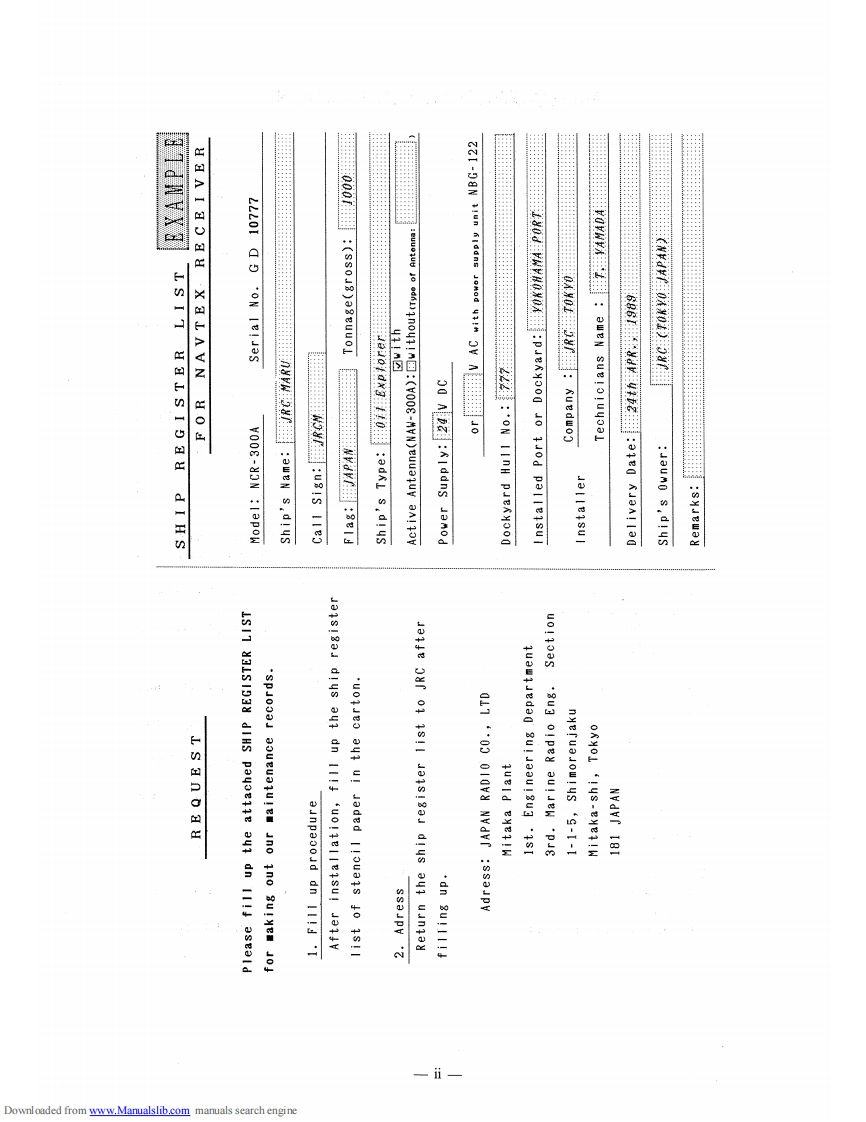 JRC_NCR-300A_Navtex_Service_Manual维修手册348072@abc昨天发布关注私信4.47MB56页031JRC_NCR-300A_Navtex_Service_Manual维修手册此内容为付费资源,请付费后查看¥16¥19黄金会员免费钻石会员免费立即购买您当前未登录!建议登陆后购买,可保存购买订单付费资源 第1页 / 共56页 第2页 / 共56页 第3页 / 共56页 第4页 / 共56页 第5页 / 共56页 试读已结束,还剩51页,您可下载完整版后进行离线阅读 THE END无线电 文本预览 ©NC月-③▣▣ANAVTEX RECEIVERNAVTEX22292的国JRC NCR-300ANAVTEX RECEIVERVSTB○TIOVMANUALDownloaded from www.Manualslib.com manuals search engine 查看更多 收起部分 喜欢就支持一下吧收藏