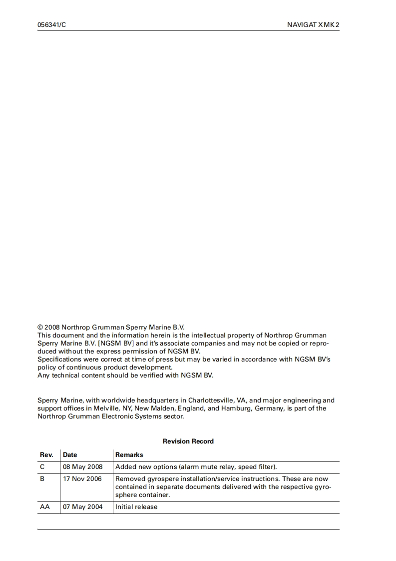 NORTHROP GRUMMANSperry MarineOperation,Installation and Service ManualNAVIGAT X MK2Digital Gyrocompass SystemType 4991,Stock No.74799056341/C,08May2008Northrop Grumman Sperry Marine B.V.(Representative Office)Voltmanstr..19·D-2o097·Hamburg,.GermanyTel.:+49-40-299 00-0.Fax:+49-40-299 00-146.E-mail:service.de @sperry.ngc.com