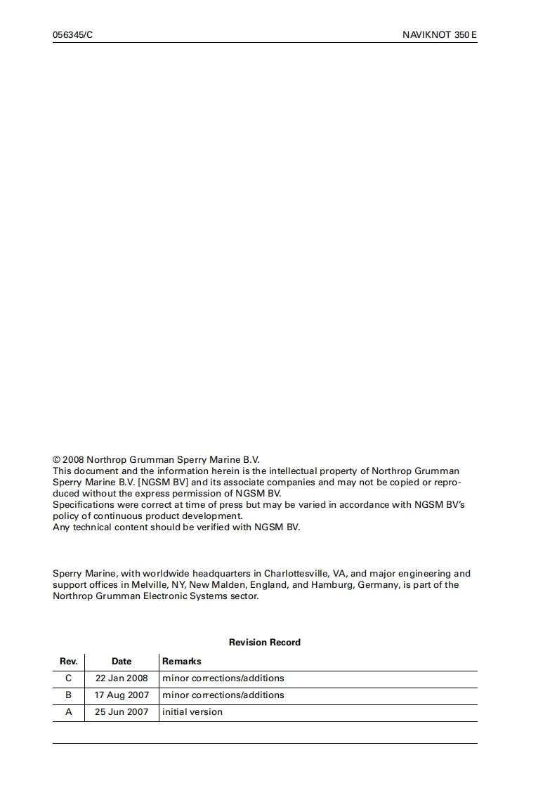 NORTHROP GRUMMANSperry MarineOperation,Installation and Service ManualSperry MarlneNAVIKNOTNAVIKNOT 350EMASTERACKMENUSTW12.8knENTERDAIlYTOTAL1234WM123457W☑DIMDIMSpeed LogNAVIKNOT 350EElectromagnetic Speed Log056345/C,22Jan2008Northrop Grumman Sperry Marine B.V.(Representative Office)Woltmanstr.19.20097 Hamburg,GermanyTel.:+49-40-299 00-0.Fax:+49-40-299 00-146.E-mail:service.de @sperry.ngc.com