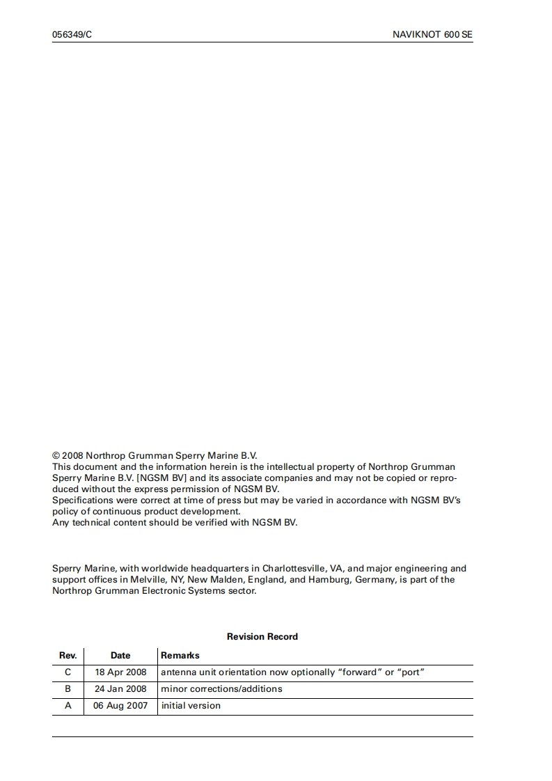 NORTHROP GRUMMANSperry MarineOperation,Installation and Service ManualSperry MarineNAVIKNOTSOGMASTERACK600SEGPS QUAL12.80G000NMILESDAILY0.12123456]TOTAIkn123458.71Sooud LouNAVIKNOT 600 SECombined Satellite and Electromagnetic Speed Log056349/C,18Apr2008Northrop Grumman Sperry Marine B.V.(Representative Office)Woltmanstr.19.D-20097.Hamburg,GermanyTel.:+49-40-299 00-0.Fax:+49-40-299 00-146.E-mail:service.de@sperry.ngc.com