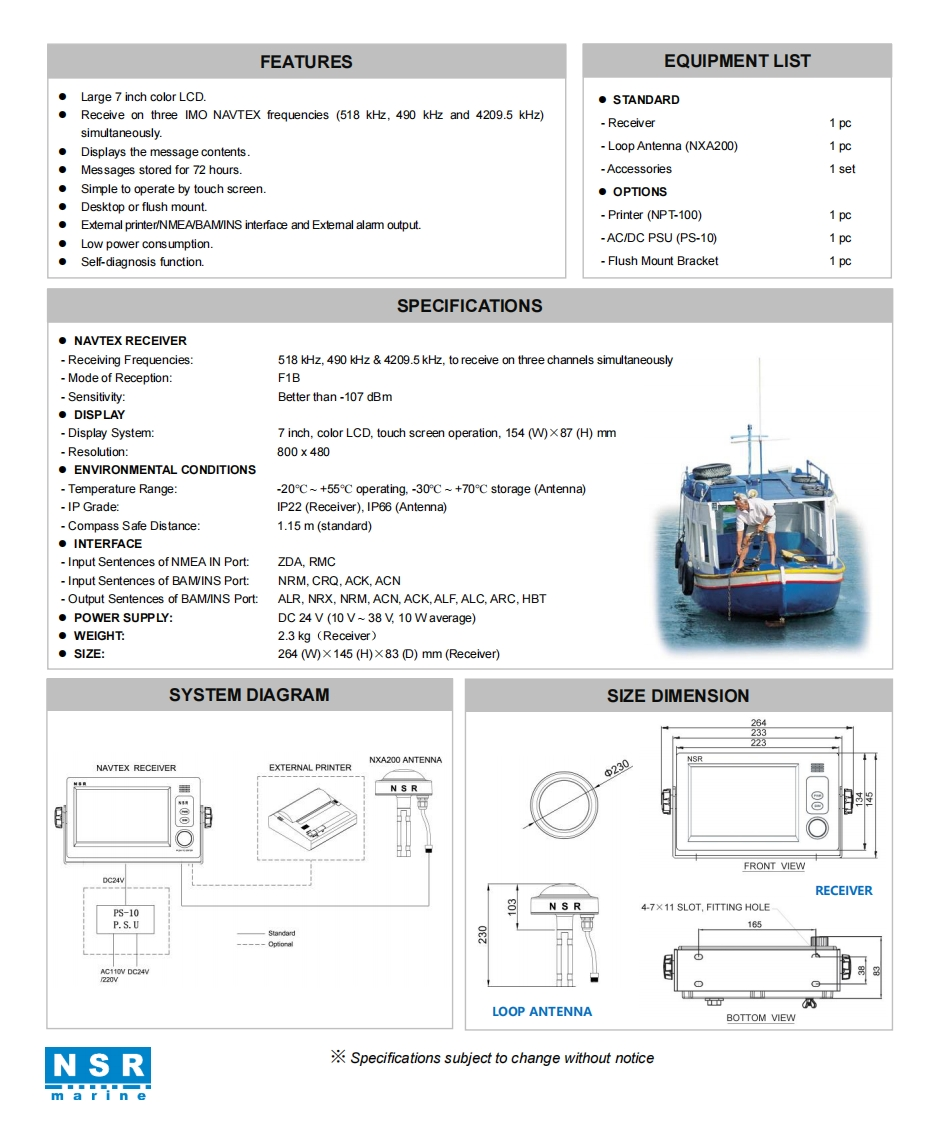 NAVTEX RECEIVERNVX-1000/NVX-3000NSR's new generation of NAVTEX Receiver:SDR(Software Defined Radio)technology,super sensitivityLarge 7 inch color LCD,touch screen operationMeet the latest rules:IMO MSC.430(98),IMO MSC.302(87),IEC 62923-1,IEC 62923-2Real three-channel receivingData interface to BAM system/INSType approval with DNV(MED),CCS and VRNVX-1000DNV,CCS,VRNVX-3000DNVNSR518KIDDATE TIME SIZE STATE0H0802/0302149287☒MENU000702/0302:49287@0F0602/0302:49287回0E0502/0302:49287☒TAGPWRG00402/0302:48287☒回PRINTDIM080302/0302:48287回080202/0302148287四TO INS0A0102/0302:48287@T1ESYs2018-02-0302:55:37UT0NAVTEX RECEIVERPUSH TO ENTERVIEW MESSAGE15184904209STATION SETTINGSTORAGEFREQ.=518kHzPAGEZJ0249 EAST CHINA SEA M/T JIU HUA SHAN518K&01/01PASS THEABACKFREQ518DREDGED DEEP-CHANNEL OUTSIDE XIAZHIMENN0490KIDFAIRHAY V1A29-41.26N/122-31.31E29-41PREV.PRINTQA0155N/122-30.21E29-43.88N/122-21.39E294209KTI ME -UTC44.28N/122-19.86E02-03NEXT02:48AN0D29-45.30N/122-18.50EFR0M280545UTCALLSIZETO 280645UTC APR ENTRANCE PROHIBITED287ZHEJIANGPRINTINSUNALLCER00%MSA CHINASTATETO INSBACKNNNNCONTENTONNAVIGATIONAL WARNING9GMDSSTOUCH SCREENDNVCOLORFPGABAM⊙DISPLAY