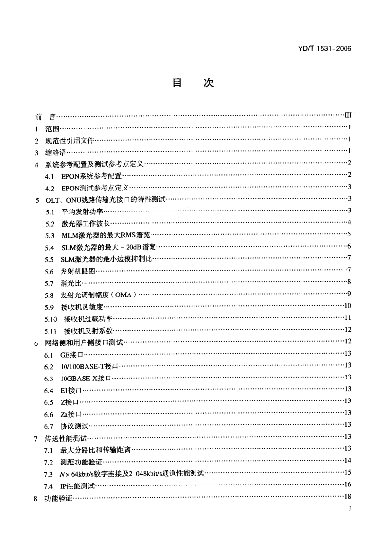 YD-T1531-2006348072@abc4个月前发布关注私信1.15MB38页031YD-T1531-2006此内容为付费资源,请付费后查看¥21¥31黄金会员免费钻石会员免费立即购买您当前未登录!建议登陆后购买,可保存购买订单付费资源 第1页 / 共38页 第2页 / 共38页 试读已结束,还剩36页,您可下载完整版后进行离线阅读 THE END标准规范 文本预览 YO中华人民共和国通信行业标准YDT1531-2006接入网设备测试方法基于以太网方式的无源光网络EPON)Test Method for Access Network Equipment-Passive Optical Network Based on Ethernet(EPON)2006-12-11发布2007-01-01实施中华人民共和国信息产业部发布 查看更多 收起部分 喜欢就支持一下吧收藏