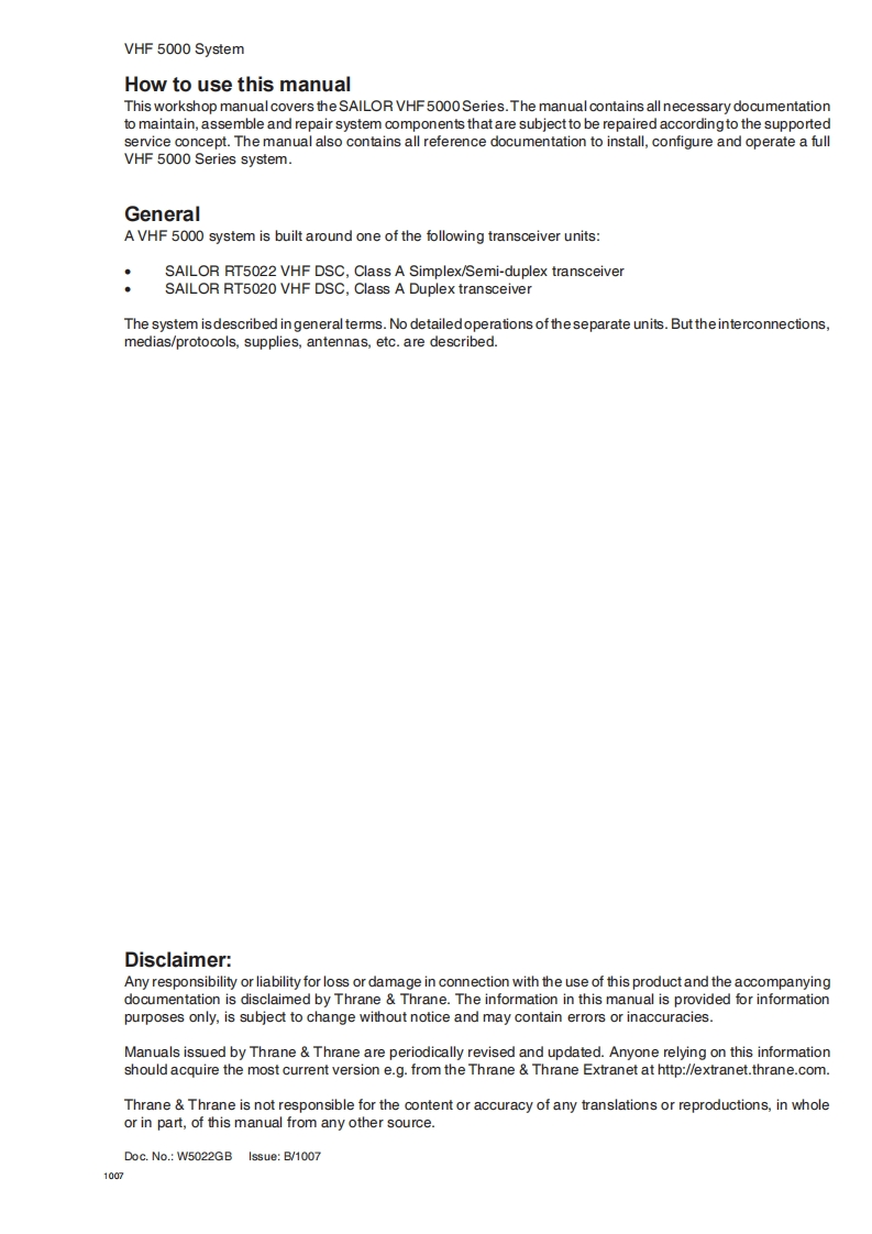 VHF 5000 SystemWorkshop ManualFor a complete workshop manual for VHF 5000 System includes the following manuals:B5006COMOperation Manual SB5006 Service ToolB5022GB0Operation Manual RT5022 VHF/RT5020 VHF DSC Duplex