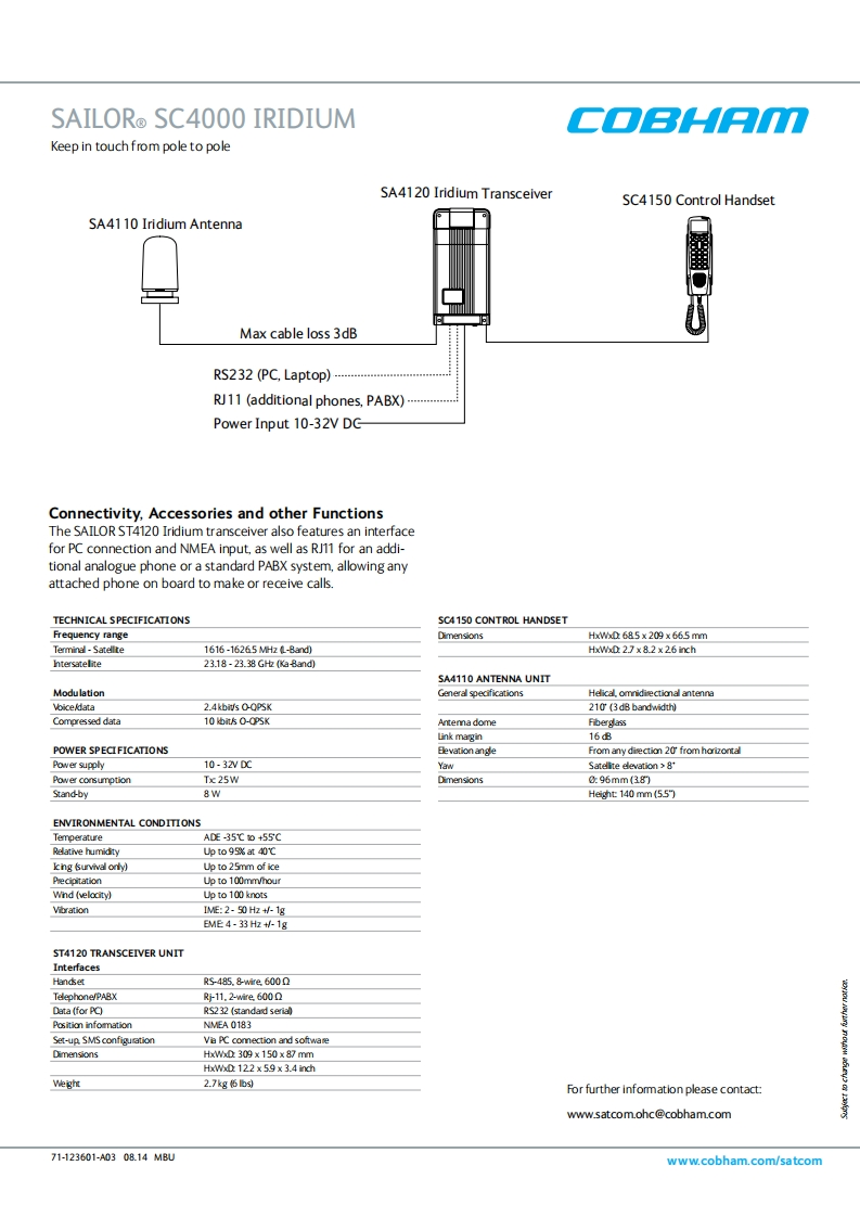 SAILOR SC4000 IRIDIUMCOBHAmKeep in touch from pole to pole2014 Product SheetThe most important thing we build is trustThe SAILOR SC4000 Iridium isAntenna-Slim,compact but sturdy,Transceiver-The robust SAILOR ST4120a satellite phone system for allthe antenna has no moving parts and istransceiver features metal protectivesizes and types of vessel.Usingdesigned to be highly weather-resistant.housing for professional maritime instal-the established Iridium network,The helix construction is coated withlations.The easy access to the SIM cardSAILOR SC4000 Iridium offersglass-enforced epoxy,making the antennareader allows crew members straightfor-low-cost airtime and is built forable to withstand the extreme conditionsward insertion of their own SIM cards.Itat sea.is easy to install and is the central hub ofthe maritime environment.the entire SAILOR SC4000 Iridium system.Handset-The SAILOR SC4150 is anFull satellite coverageintelligent handset and control unit that■One global ratefeatures mobile phone style operationSeamless global telephoneon a large LCD screen with a logical menuIndividual user billingfor ease of use.It can store up to 100On board telephone box-simple tocontacts with repeat call and call log funcinstall in convenient locationstionality and the high quality loud-speakerData capability-2.4 or 10 kbps for basicensures all calls are easily heard whereveryou are on board.emailinternet and PC based SMSThe SAILOR SC4000 Iridium telephonesupports a wide selection of crew callingplans and prepaid scratch cards.Crewmembers can manage and control theirown costs directly.The Iridium Satellite NetworkIridium is a truly global satellite networkwith 66 cross-linked low orbiting satellitesthat form a world-wide grid.From theArctic to Antarctica,a satellite is always insight and ready to handle your call.The SystemThe SAILOR SC4000 Iridium is approvedaccording to international maritime stan-dards and is designed and built to theSAILORsame high quality that has made SAILOR afamous name in regards to reliability andsuitability for professional use at sea.Itis easy to install and features three corecomponents:2u1r00www.cobham.com/satcom