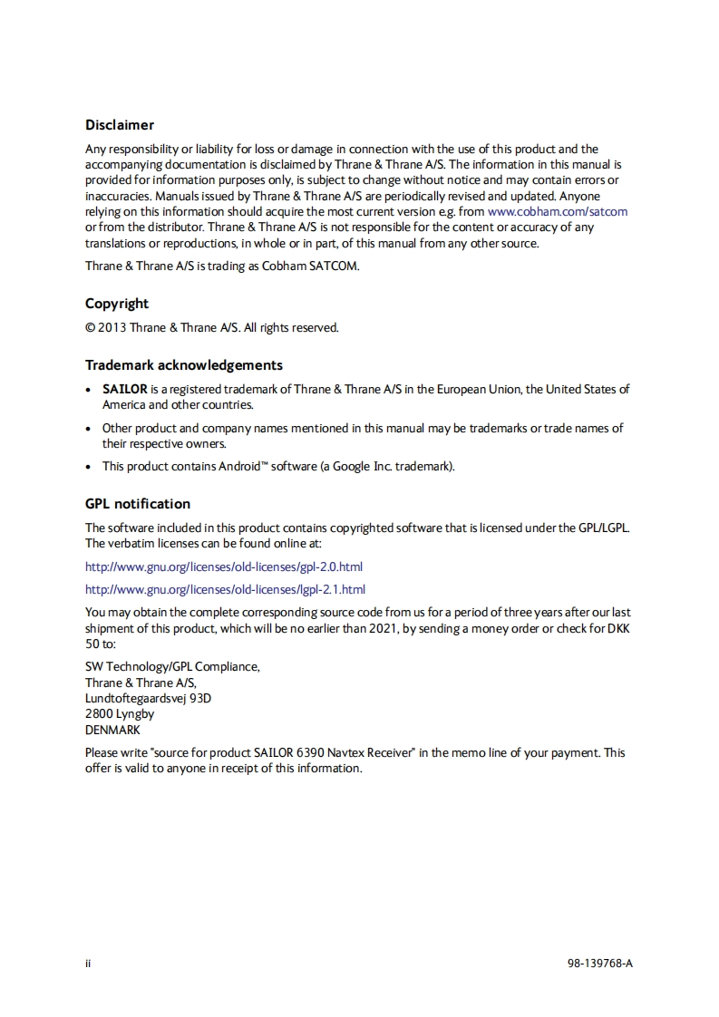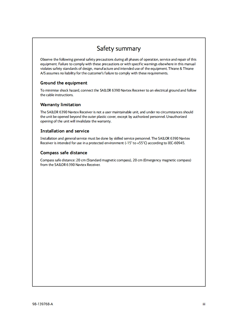 Salior_6390_Navtex_Receiver_Installation_Manual操作说明书手册348072@abc11小时前发布关注私信1MB61页022Salior_6390_Navtex_Receiver_Installation_Manual操作说明书手册此内容为付费资源,请付费后查看¥16¥19黄金会员免费钻石会员免费立即购买您当前未登录!建议登陆后购买,可保存购买订单付费资源 第1页 / 共61页 第2页 / 共61页 第3页 / 共61页 第4页 / 共61页 第5页 / 共61页 试读已结束,还剩56页,您可下载完整版后进行离线阅读 THE END无线电 文本预览 SAILOR 6390 Navtex ReceiverInstallation manualDocument number:98-139768-ARelease date:October 25,2013 查看更多 收起部分 喜欢就支持一下吧收藏